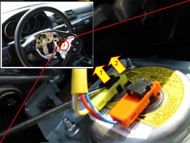 Remove the 2x rubber caps that are on either side of the back steering wheel and remove the bolts with a 10mm socket. Now carefully remove the air bag (centre of steering wheel). Unclip the airbag plug by lifting the black retainer with a small flat screw driver.