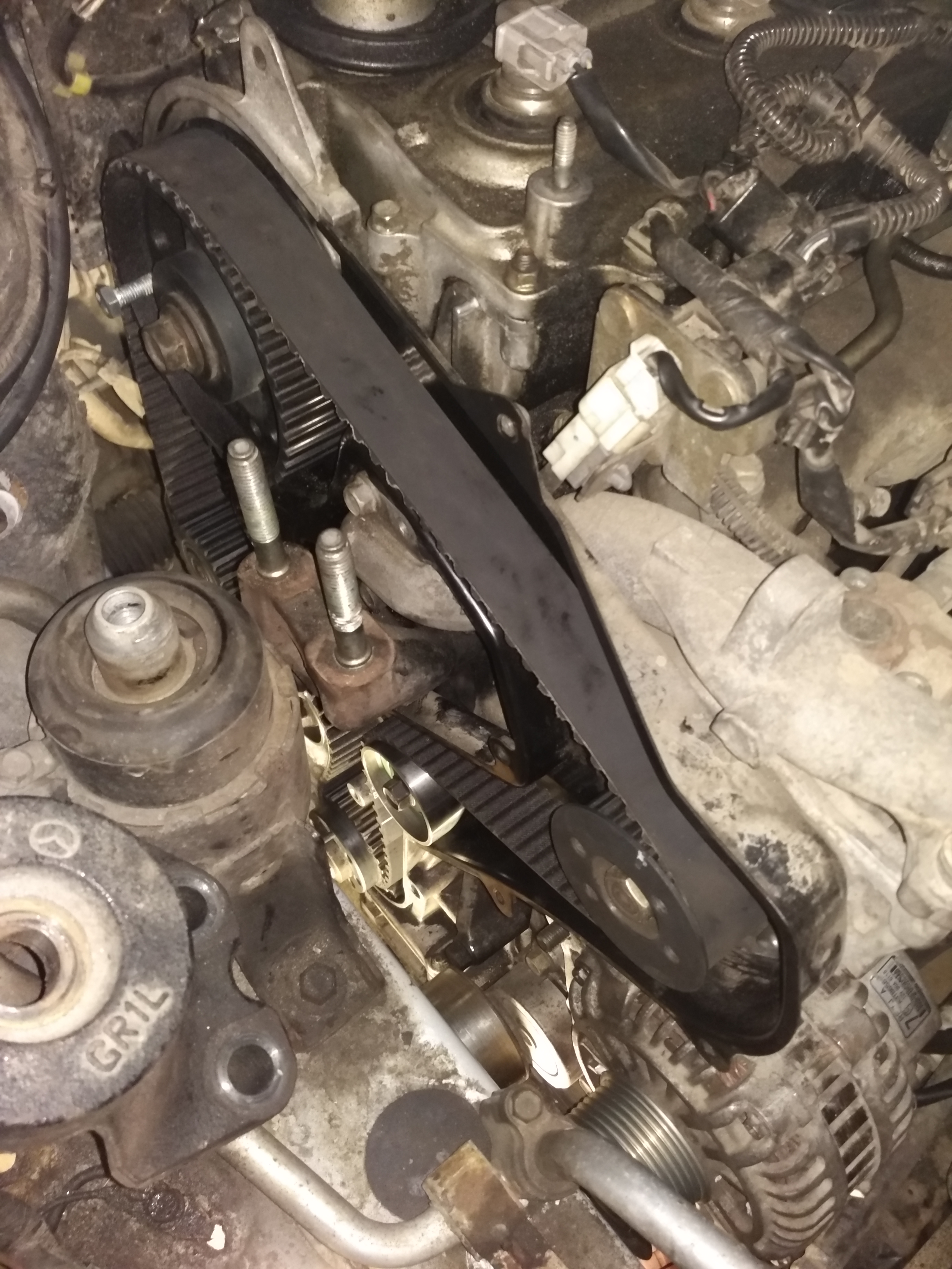 Po kilku godzinach walki wymieniony kpl. rozrządu ( oryginał ) + sprzęgło alternatora ( piski po odpaleniu zimnego silnika ustały ) i pasek wielorowkowy (pewnie jescze by pociągnął, ale miał już sporo pęknięć pomiędzy rowkami).