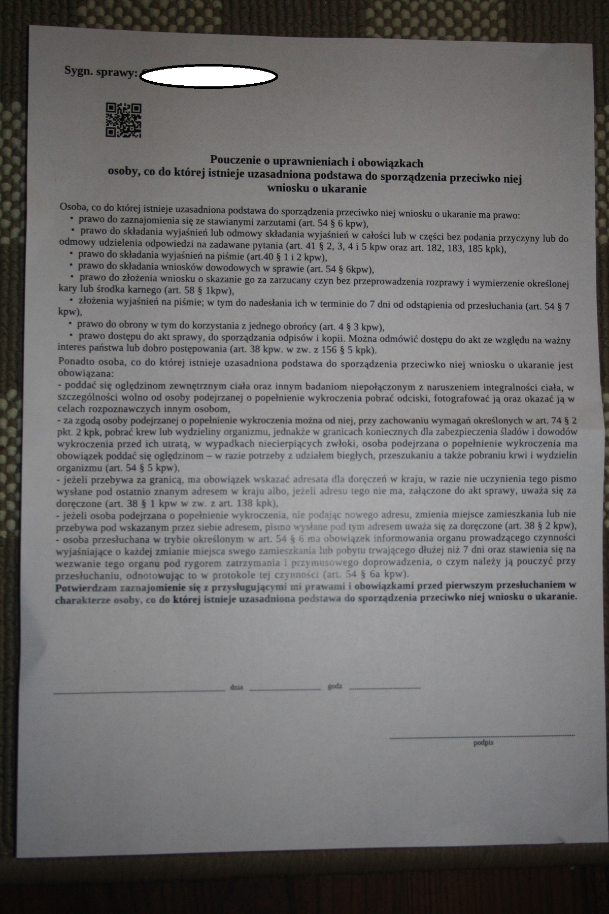 – Podpisać i później dostaniesz pismo, że w związku z tym ze zapoznałeś się ze swoimi prawami, oni odstępują od przesłuchania w siedzibie GITD ale chca wyjaśnień na piśmie, na podstawie art 54 par 7.