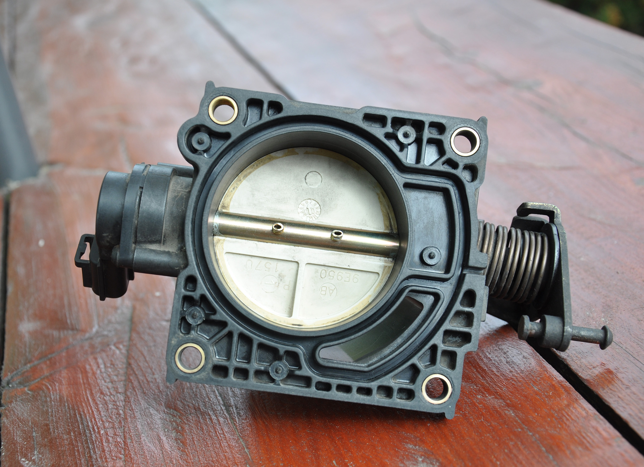 6) Sama przepustnica przykręcona jest do silnika czterema śrubami umieszczonymi na rogach. Do okręcenia potrzebny będzie klucz nasadowy 8mm. Przy wyciąganiu jej trzeba pamiętać o odpięciu wtyczki elektrycznej. Jak widać moja przepustnica jest bardzo zabrudzona.