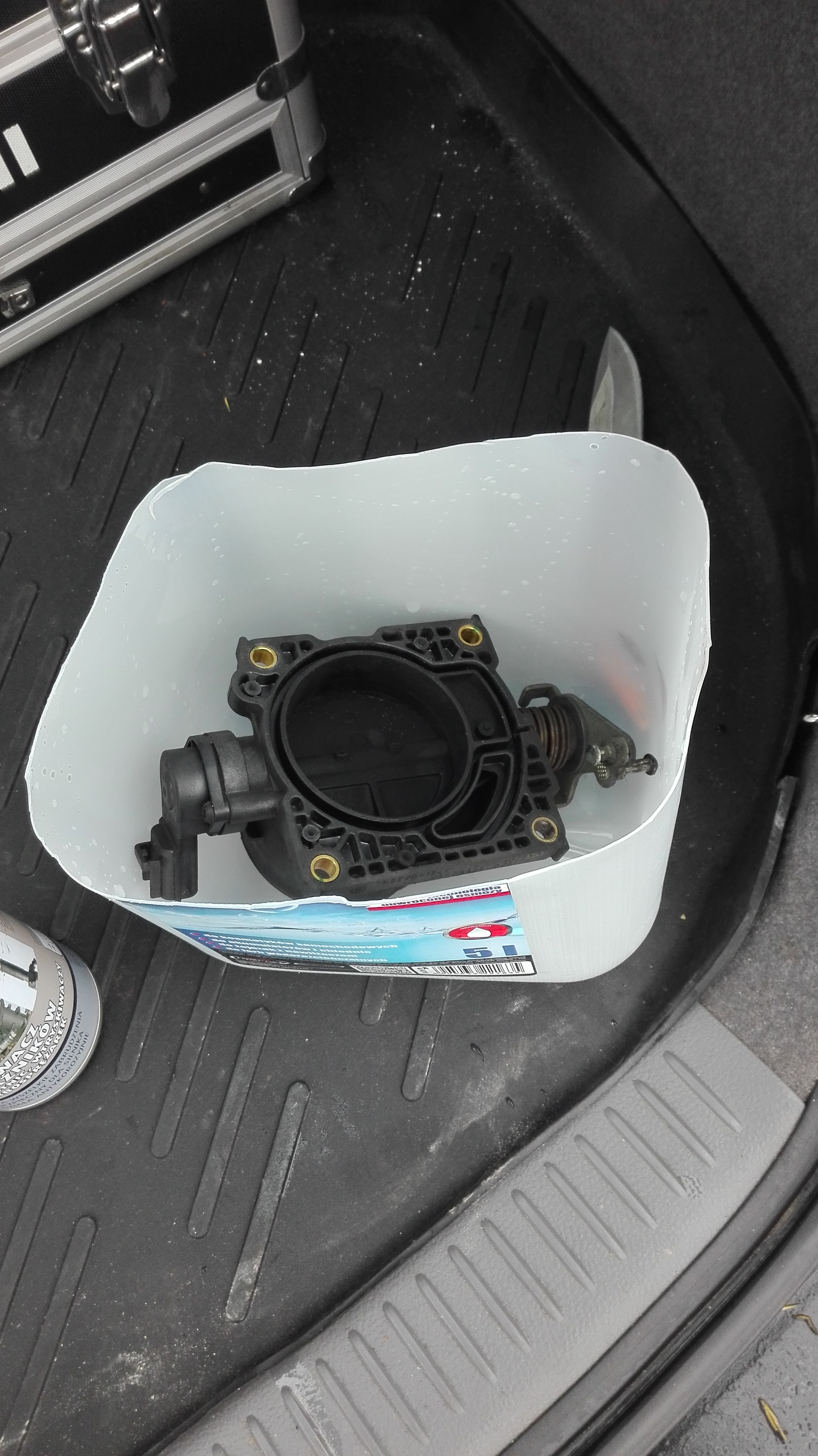 8) Najlepiej jest umieścić przepustnicę w jakimś pojemniku bo ja np wypsikałem cały preparat a przepustnica dalej brudna. Pomogłem sobie wtedy patyczkami kosmetycznymi a przepustnica mogła moczyć się w preparacie. Bez pojemnika skończył by się preparat i nie miał bym jak dalej czyścić.