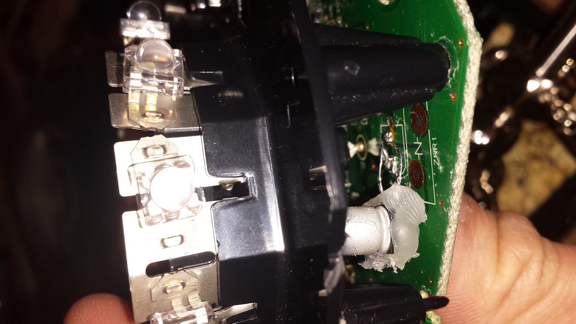 Dzisiaj zabrałem się do reflektora raz jeszcze. Podejrzewając winowajcę oderwałem delikatnie poluzowany wcześniej kondensator. Jego nóżki pękły na wysokości podstawy i ze sporym trudem dolutowałem do nich kilka miedzianych żył, po czym połączyłem z płytką (mimo wszystko nie polecam Wam tego robić na starym kondensatorze). Całość oblałem dosłownie glutem. Led'y działają, reflektor na miejscu