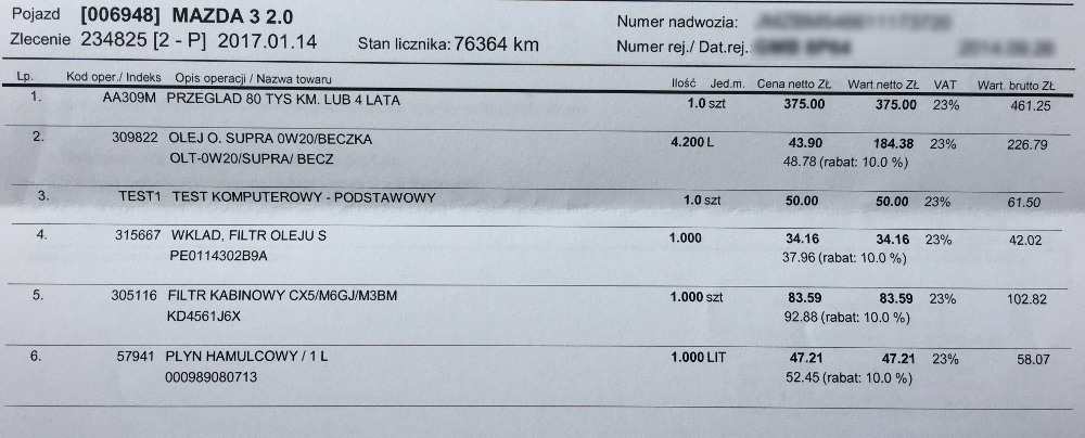 Ostatni przegląd był 23.12.2015 przy przebiegu 56 tys km, minął rok i samochód zrobił kolejne 20 tys km dlatego kolejna wymiana oleju – 4 lata nie ma, ale prawie 80tys km