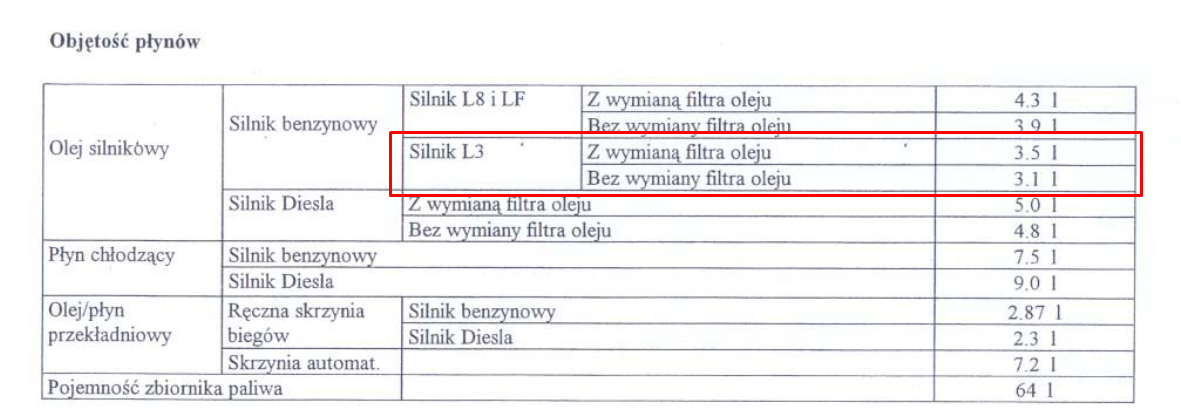 natomiast dla silnika L3 jest to odpowiednio 3,5l i 3,1l...