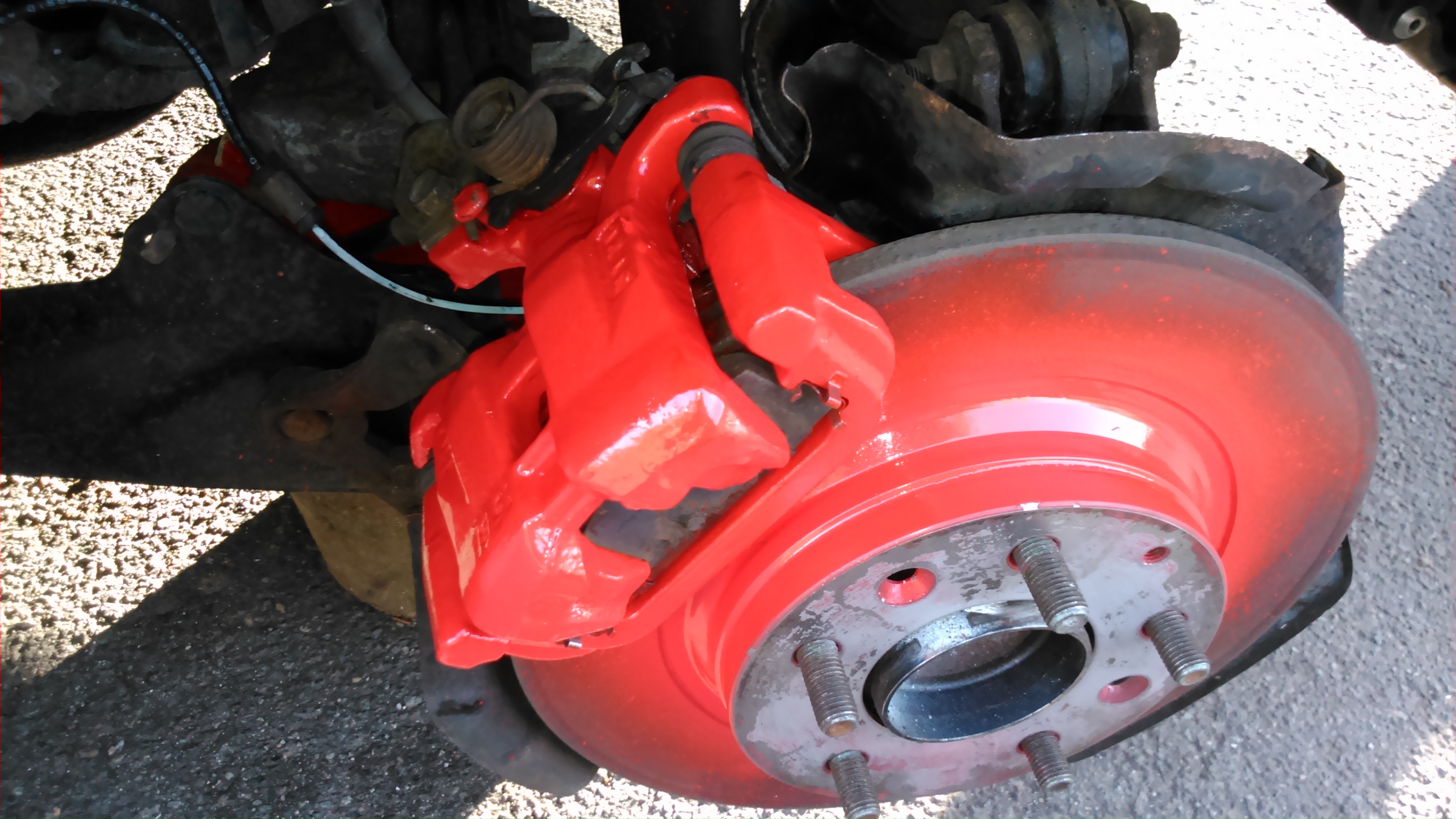 Strona kierowcy tył gotowa i czeka już tylko na koło ale mam zablokowany lewarek bo prawa strona stoi na nim i czekam jeszcze 30 min aż wyschnie zacisk. Z tarcz tylko klocki muszą zetrzeć lakier bo zapomniałem z domu nitro i nie mam czym zmyć nadmiaru lakieru