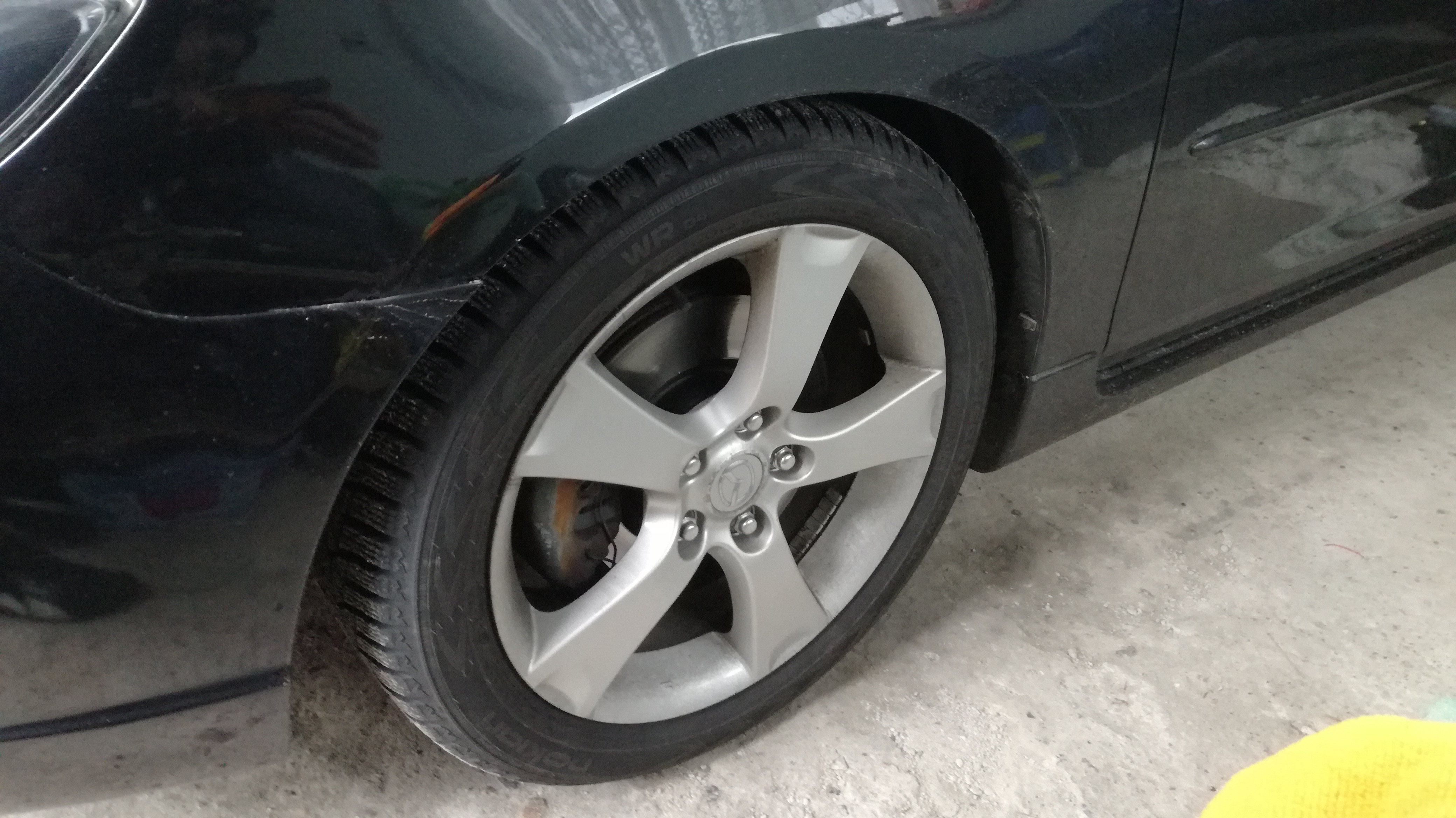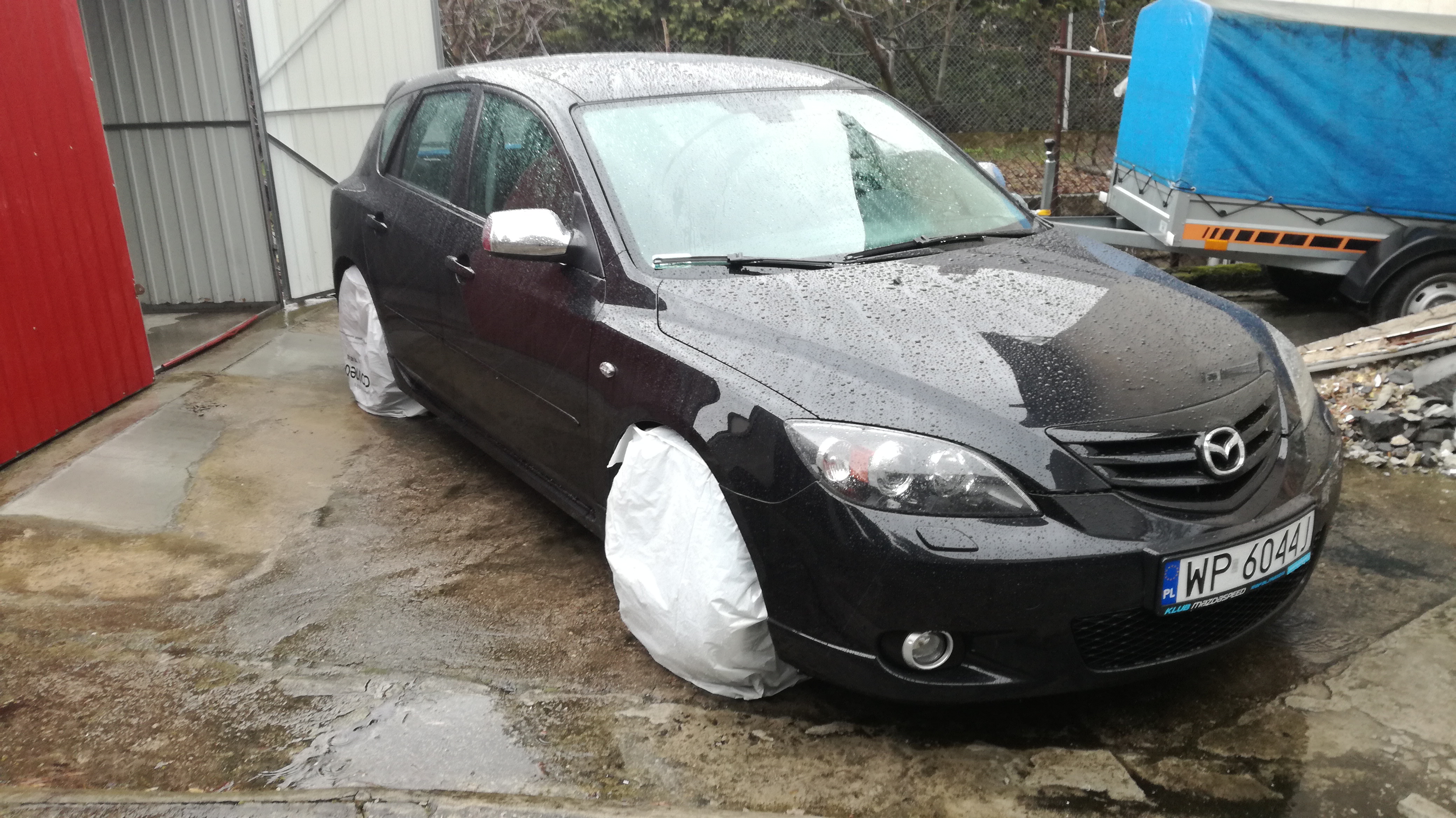 Jako że padało, a chciałem jeszcze u ojca w Saabie zrobić przekładkę kół i też mu prysnąć zaciski, musiałem wyjechać z garażu, ale nie chciałem żeby deszcz zachlapał świeżo pomalowane zaciski, więc naciągnąłem na koła worki do ich przechowywania <czarodziej>