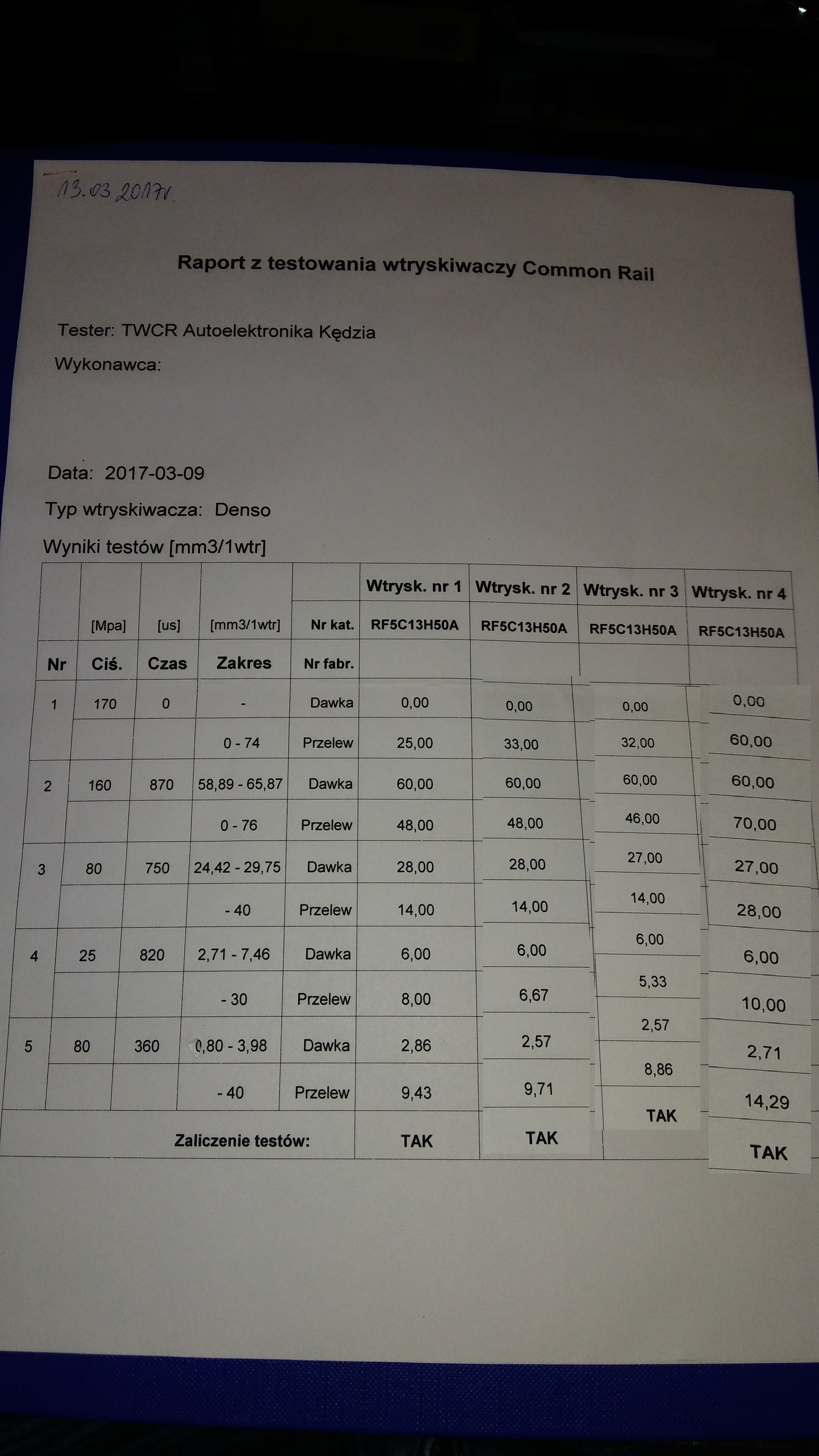 Ocena wtryskiwaczy (wydruki)
