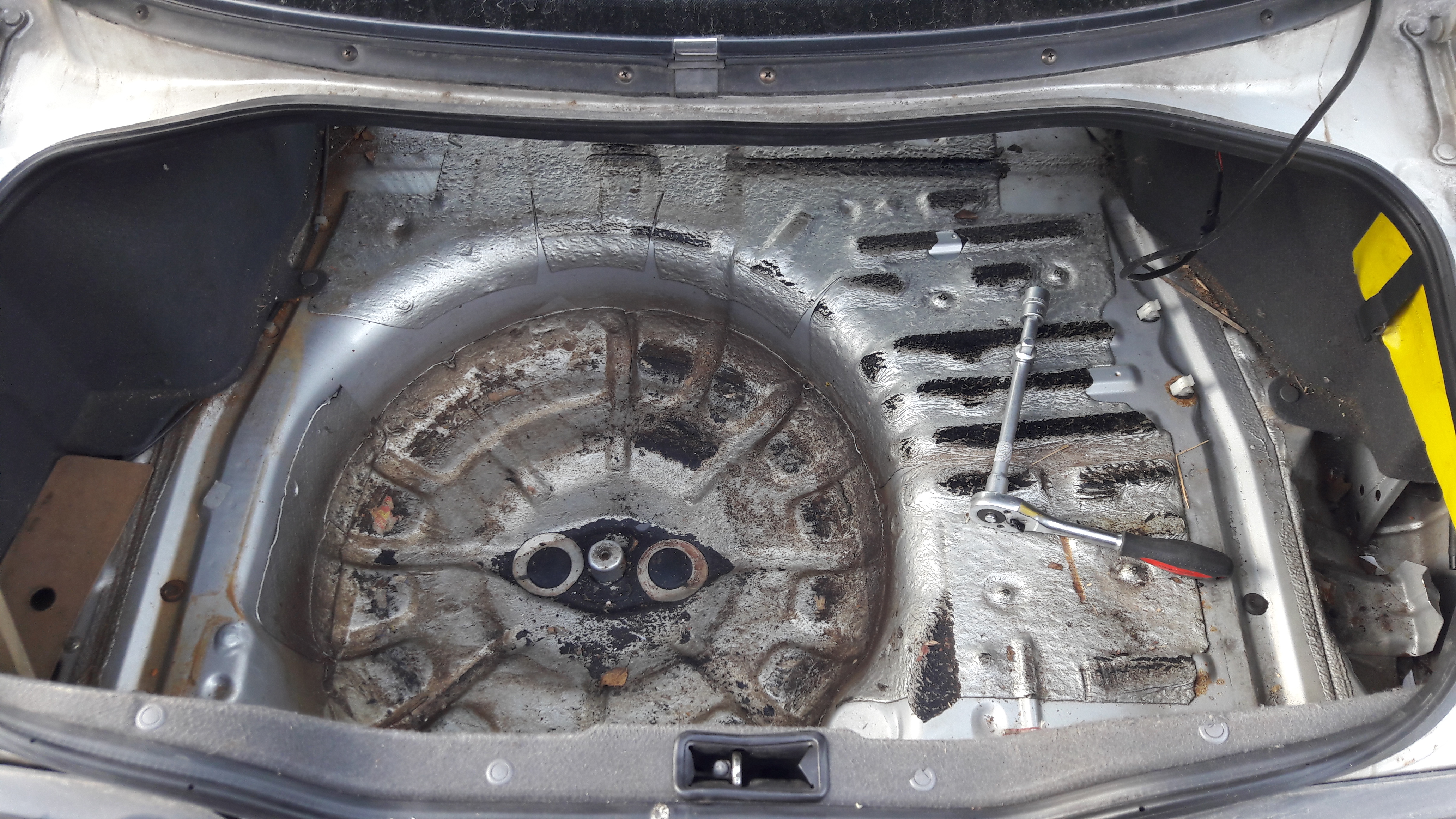 Maly update, juz raz go pisalem, ale na telefonie i gdy chcialem zamiescic post, to wyszedl mi time out i wszystko zniknelo. Z powodu duzej ilosci zajec ciezko znalezc czas na pisanie. Tak jak pisalem wczesniej w aucie byl dosc nieprzyjemny zapach, ktory dochodzil z bagaznika. Zdecydowalem sie wiec na wymontowanie wszystkich wykladzin i okladzin z bagaznika. Okazalo sie, ze stan blach jest nawek ok. Pare miejsc z ruda, ale nic powaznego. W zaglebieniu z lewej strony jest rdzawy nalot, ale to chyba dlatego, ze lewa lampa nie byla dobrze docisnieta do karoserii i wlatywala tam woda. Rowniez kolo zapasowe bylo w slabym stanie, poklejone i potluszczone i aluminium w plesni i jakies naloty na feldze.