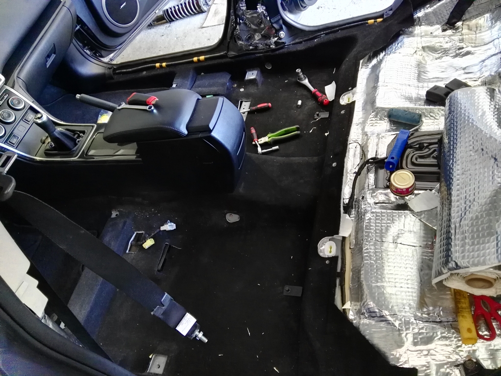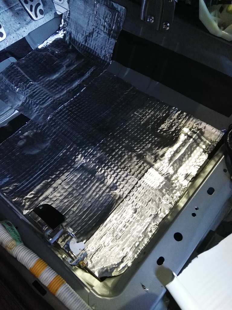 W piątek,znów poprawiłem troszeczkę fabrykę.Na warsztat poszła cała podłoga z wyciągnięciem jak najwyżej grodź silnika.I to ,w tech chwili dało najbardziej spektakularny efekt,w pracy nad wygłuszaniem autka.Tym razem użyłem innej maty niż GMS-07 PRO tylko sygnowaną przez firmę bit-mat AB-25.