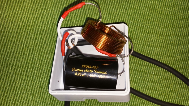 Ja wyszedłem z założenia, że podział dźwięku między średniogwizdkiem a wooferem jest realizowany nie na pasywnej zwrotnicy, tylko na wzmacniaczu/końcówkach i głośnik basowy pominąłem w tej modyfikacji a dorobiłem zwrotnicę przed średniogwizdkiem, która odcina mu górę i obcina dół w dołożonym Focalu TIS. W ten sposób system stał się 3drożny. Zastosowałem najprostszą zwrotnicę, czyli pierwszego rzędu (cięcie 6dB / oktawę), ale jeśli ona jest wystarczająca (częstotliwość podziału musi być co najmniej 2 oktawy wyżej niż częstotliwość rezonansowa gwizdka – czyli fp=>4fs) to jest wtedy najtańsza i najmniej złego wprowadza w dźwięk (spadek efektywności, przesunięcie fazy itp...) Warto jednak pokusić się o cewkę powietrzną i kondensator bipolarny, ale elektrolit i cewka z rdzeniem też oblecą i będą przy tym mniejsze i tańsze)