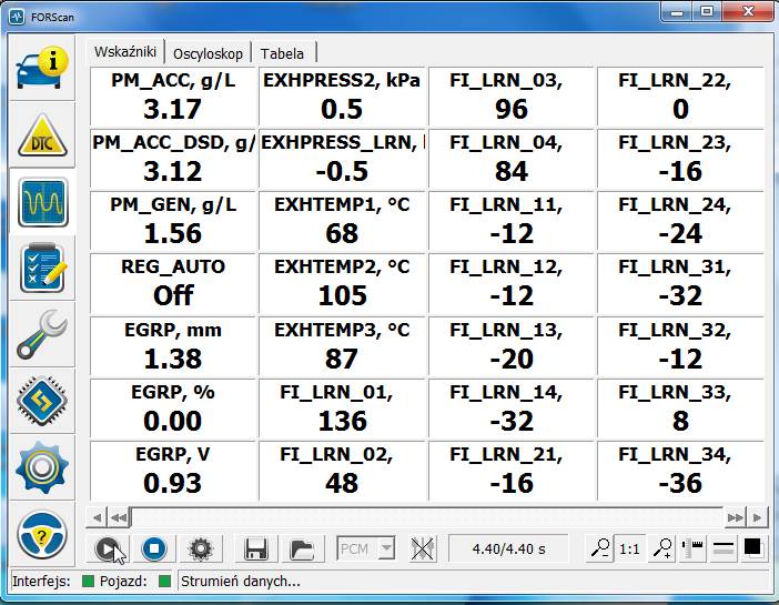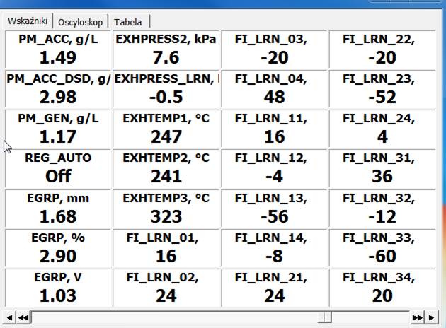 Objawy: EGR wyczyszczony, korekty wtryskiwaczy ujemne, w większości od -80 do -10. Auto ma problem z korelacją wskaźników PM_ACC, PM_ACC_DSD oraz PM_GEN.
