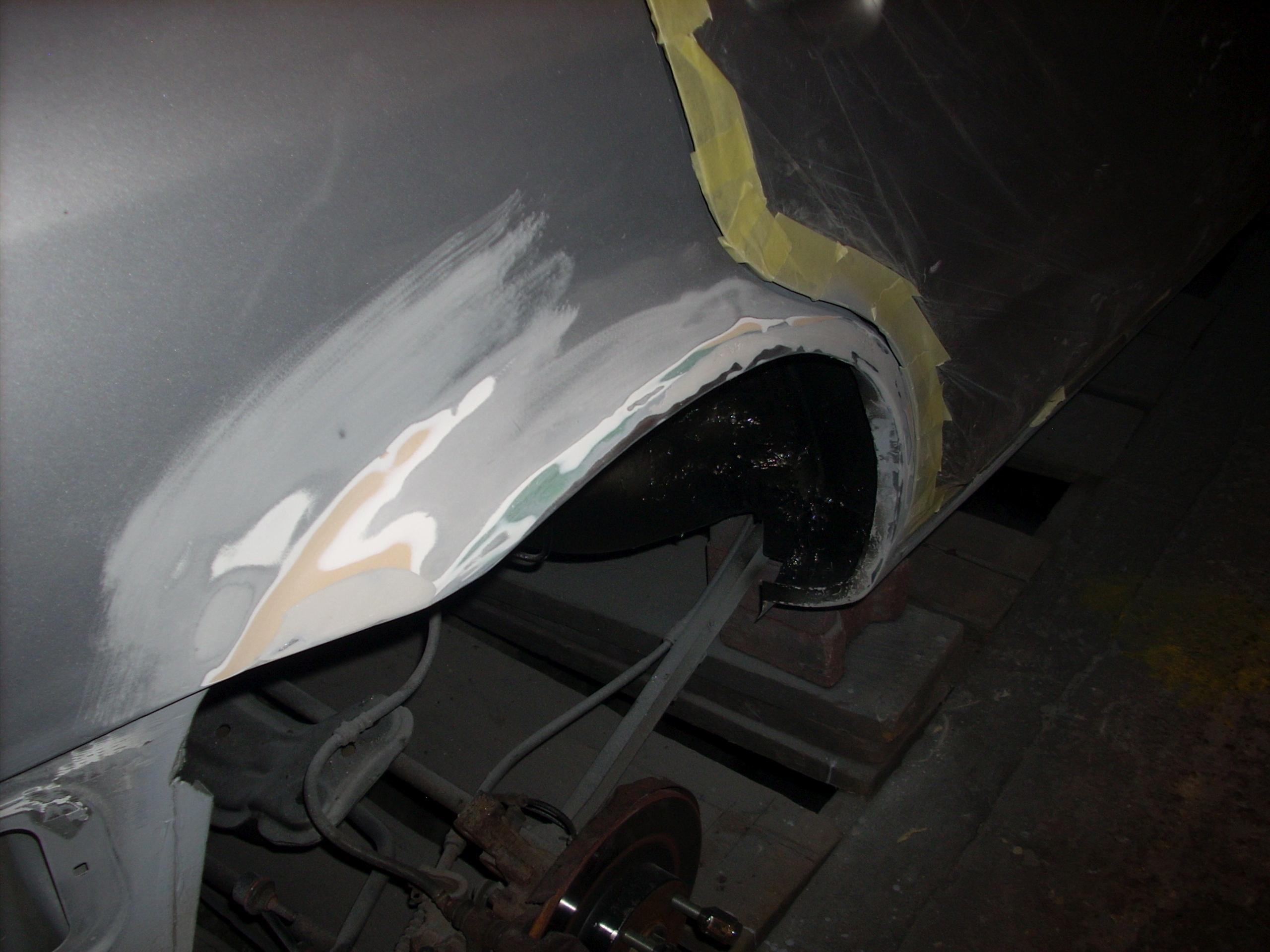 Dzisiaj udało się ukończyć całe spawanie i nawet udało się zarzucić chemię na całą pupę od spodu, oczywiście najpierw poleciał APP R-stop na wżery, następnie epoksyd w dwóch grubych warstwach, następnie masa uszczelniająca spawy na bazie kauczuku i na to poszedł baran Gravit 650 od Novola w ilości 3 litrów