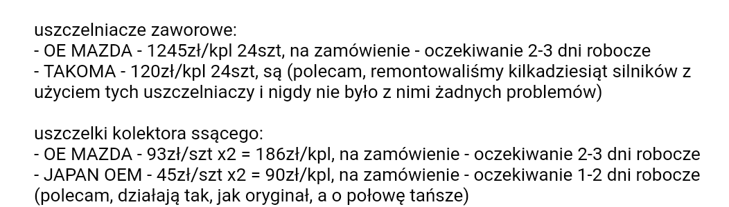 Taka wycene uszczelniaczy zaworowych otrzymałem z carspeedu, sorry ale to nie jest 2 razy wiecej tylko bagatela 10 razy wiecej <glupek2>