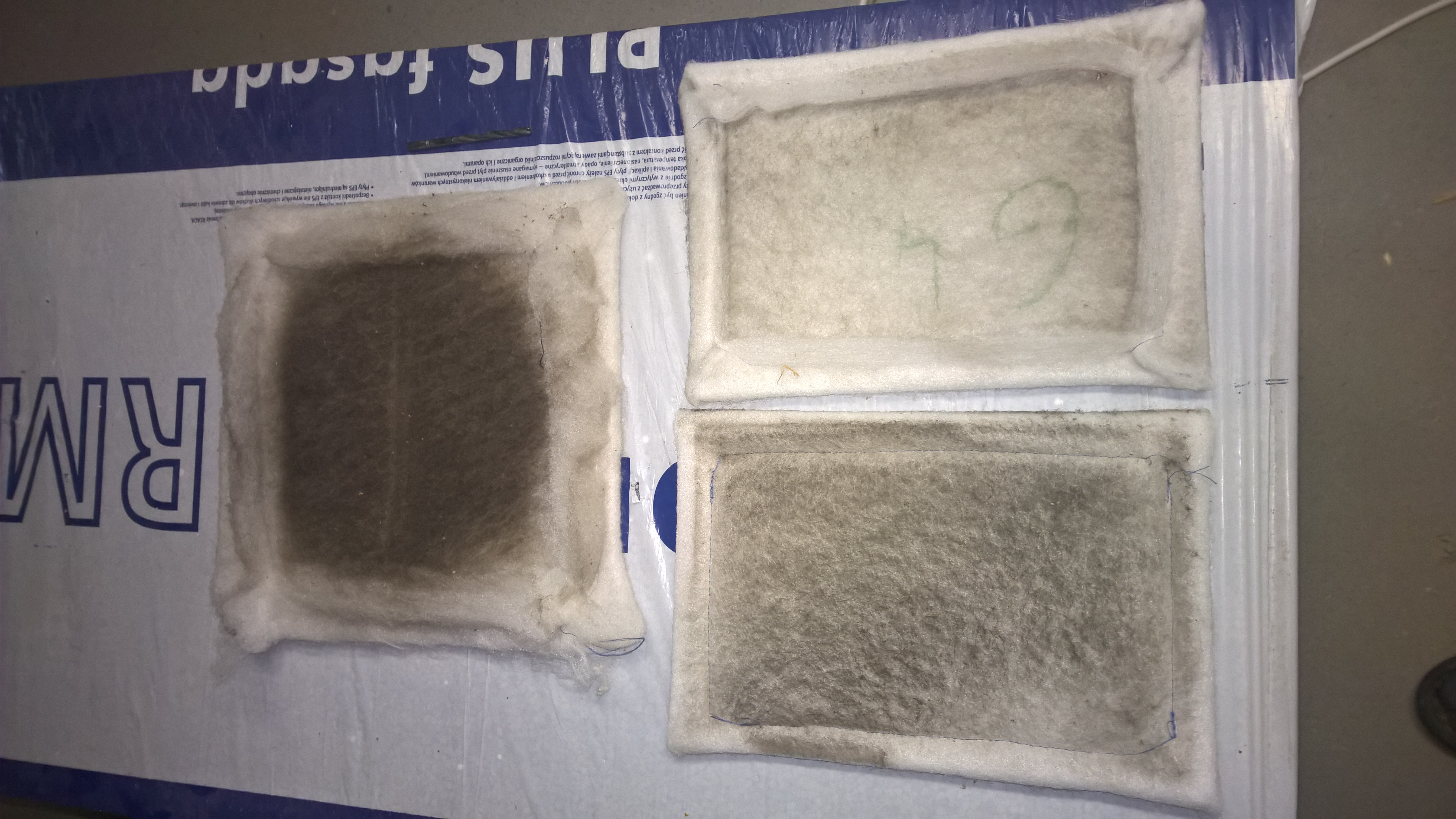 Jakby ktoś nie był zdecydowany, tak wygladaja filtry po miesiącu pracy,u góry z czerpni, na dole po lewej nawiew do reku, po prawej wyciąg z domu.