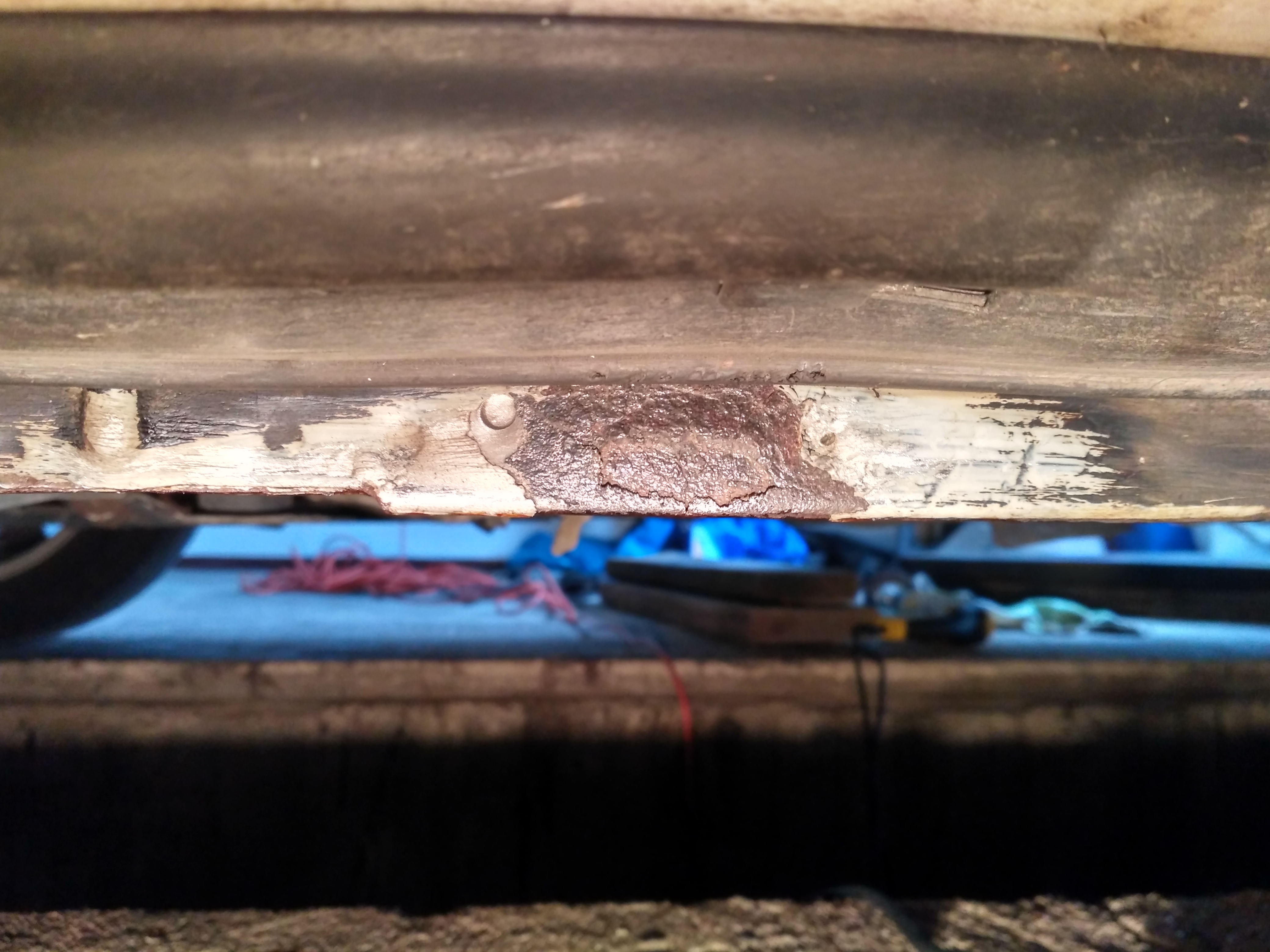 Po czterech latach od zabezpieczenia (strona 24 postu) zrobiłem poprawki. Trzeba było poprawiać w tych samych miejscach gdzie atakowała ruda ale rdza była powierzchniowa. Ale mam problem z progiem w jednym miejscu za wzmocnieniem za przednim kołem mocno spuchł mi próg, oklepałem to młotkiem i okazało się że mam sporą dziurę w jednej blasze a drugą ostro żre. Zabezpieczyłem to. I tu moje pytanie. Czy w takim przypadku naprawa blacharska jest miejscowa czy do roboty jest cały próg? Ile to może kosztować?