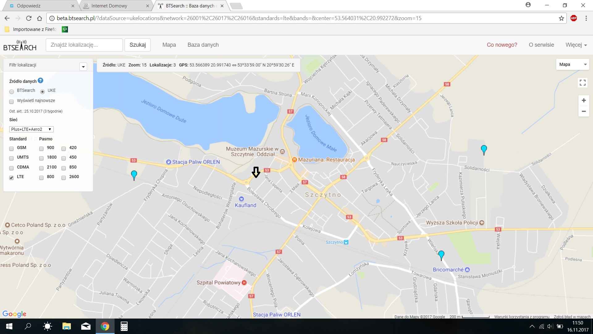 Dlatego wziąłem sprzęt na dwa miesiące żeby przetestować jak to jest na prawdę i takie są moje wnioski. O tej porze czyli jak wszyscy są w pracy a dzieci w szkole to antenę mogę rzucić gdziekolwiek i choć parametry LTE są denne to prędkość ściągania mam na poziomie 26 Mb/s i jest super. Niestety wieczorem na tym samym ustawieniu anteny co teraz mam jakieś 2-3 Mb/s a idąc do teściów gdzie z okna widać antenę nadawczą (900m) czyli teoretycznie sygnał idzie bez żadnych przeszkód wyciągam średnio 10Mb/s i a parametry LTE są bardzo dobre w porywach do tych 15 dojdzie ale trzeba się nagimnastykować żeby odpowiednio ustawić antenę. Mam jeszcze plan iść na balkon sąsiadki która mieszka na ostatnim piętrze ma balkon nade mną lekko pod skosem, wystawię antenę na rurze ponad dach bloku, wtedy jest opcja odbioru z wszystkich trzech anten w mieście. Strzałką zaznaczyłem gdzie mieszkam.