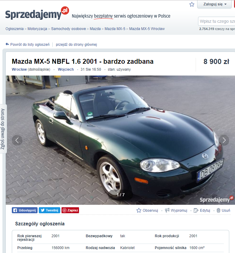 Poszukuję osoby ogarniającej temat mx 5 z Wrocławia, która byłaby na tyle uprzejma, żeby poświęcić czas na obejrzenie dla mnie tego egzemplarza: