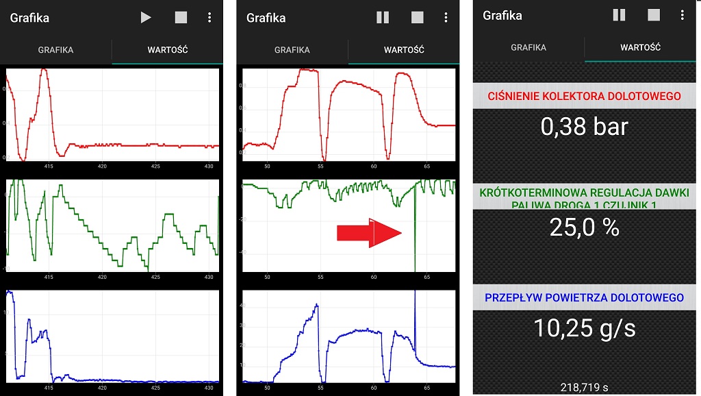 Jest to widoczne tylko na napięciu sondy 1, korekcji i czujniku MAF.