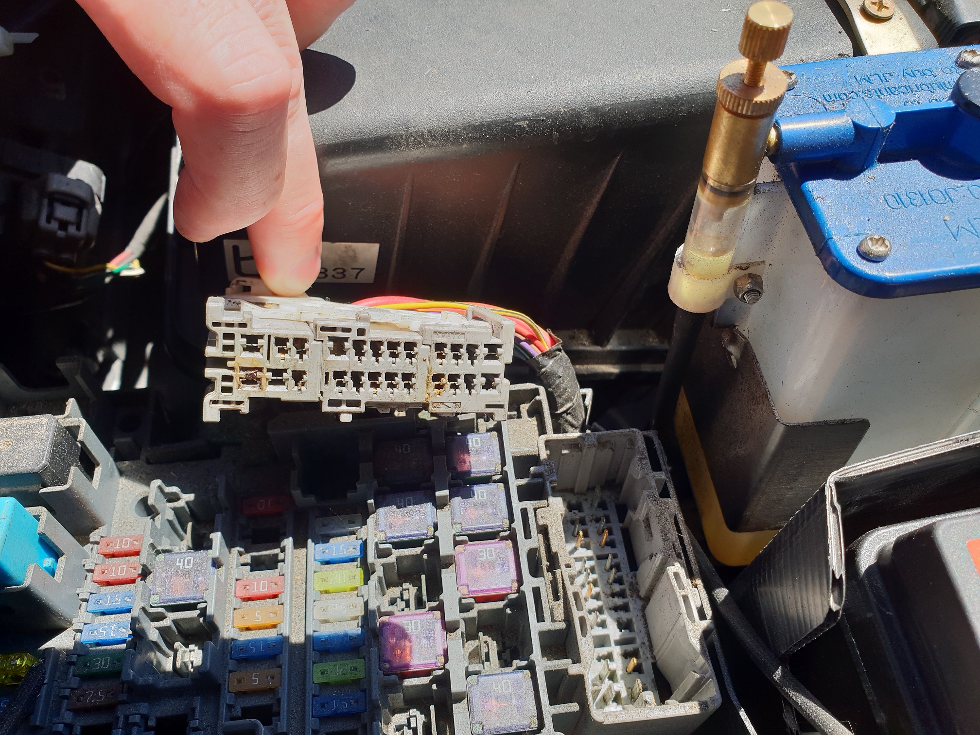 Jest też ciąg dalszy poszukiwań samozałączającego się alarmu. Szperałem trochę po necie i różnych forach i doszedłem do ciekawych konkluzji. Mianowicie zworka na krańcówce pod maską nic nie dała – jak wyło tak wyło. Odpiąłem także kostkę ze skrzynki z bezpiecznikami pod maską i znalazłem cudaka z popalonymi stykami