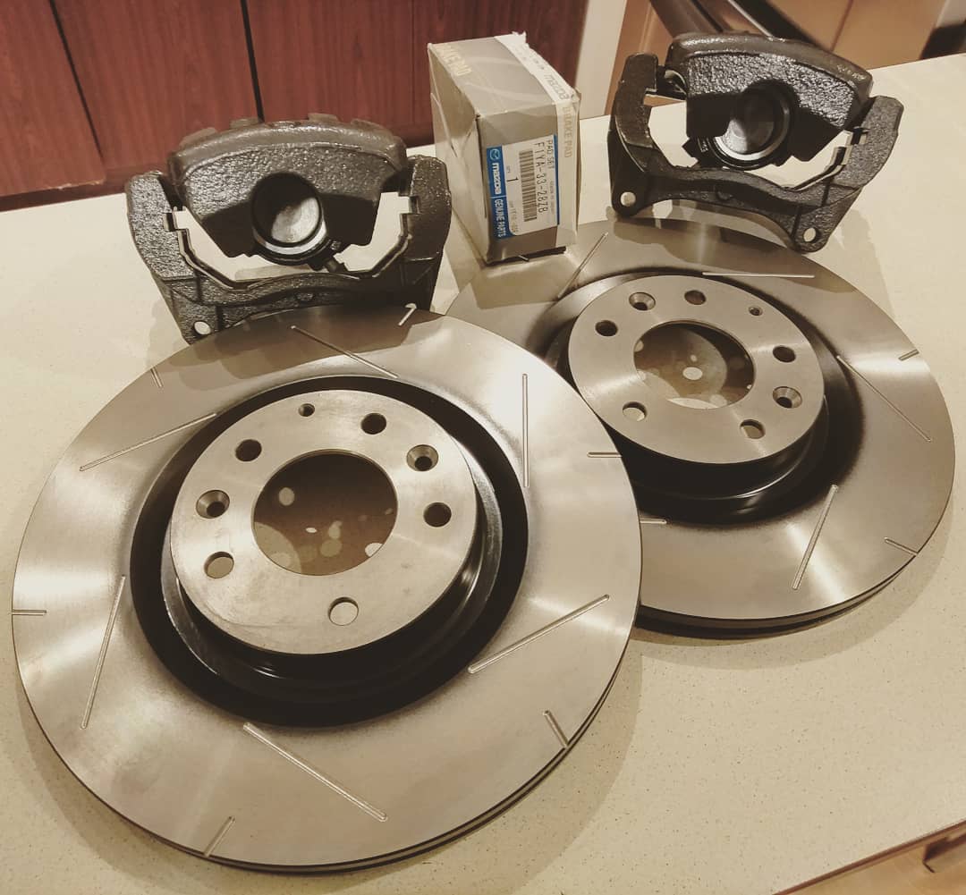 -zaciski hamulcowe zapożyczone z Mazdy RX-8 231km, wypiaskowane, polakierowane w kolor Machine Grey z aktualnej palety Mazdy, kompletnie zregenerowane na nowych zestawach naprawczych wraz z nowymi tłoczkami,