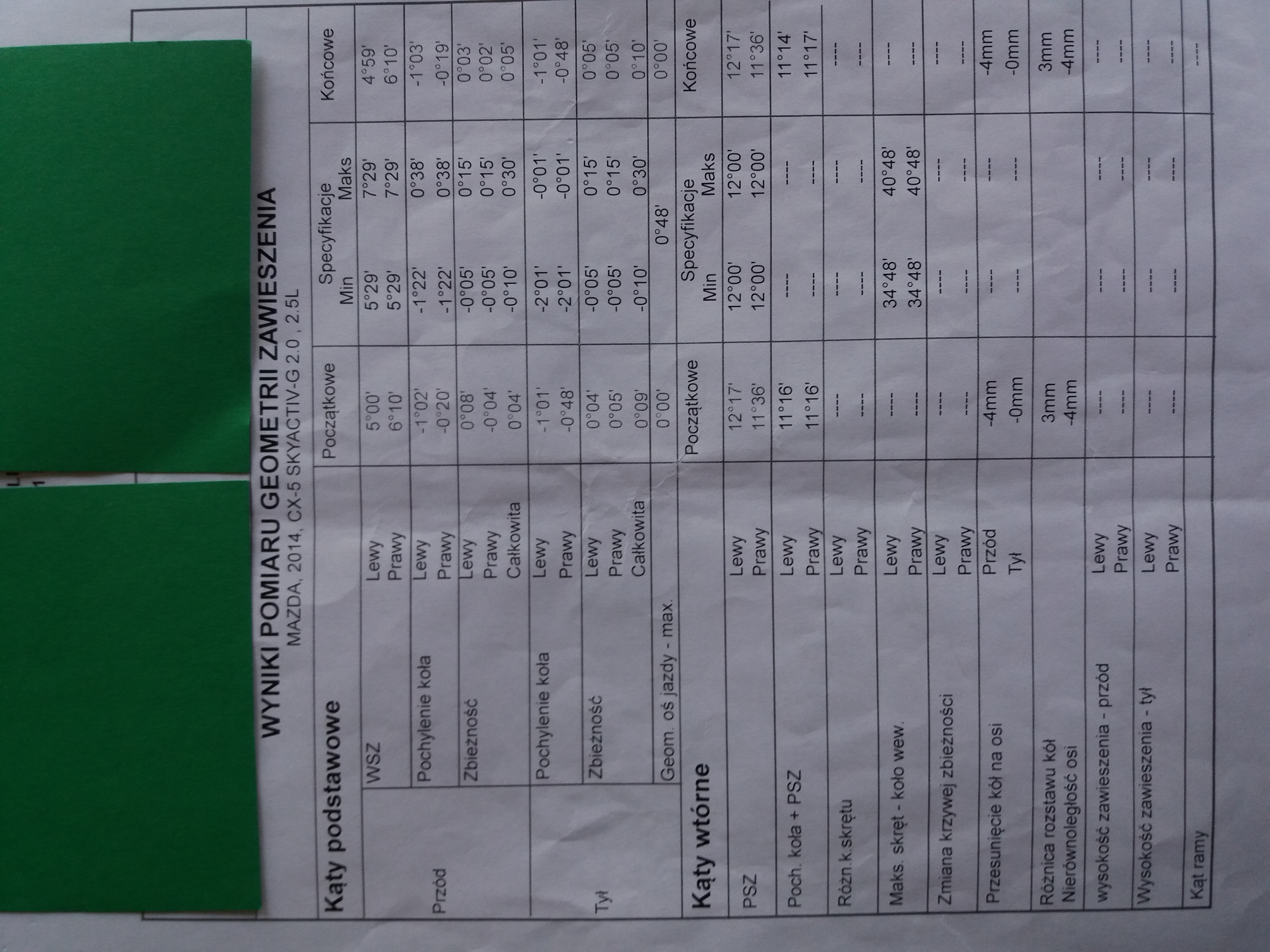 Witam. Mógłby ktoś podrzucić prawidłowe ustawienia zbieżności i geometrii kół dla Mazdy CX-5 z 2015 roku. Dziękuję