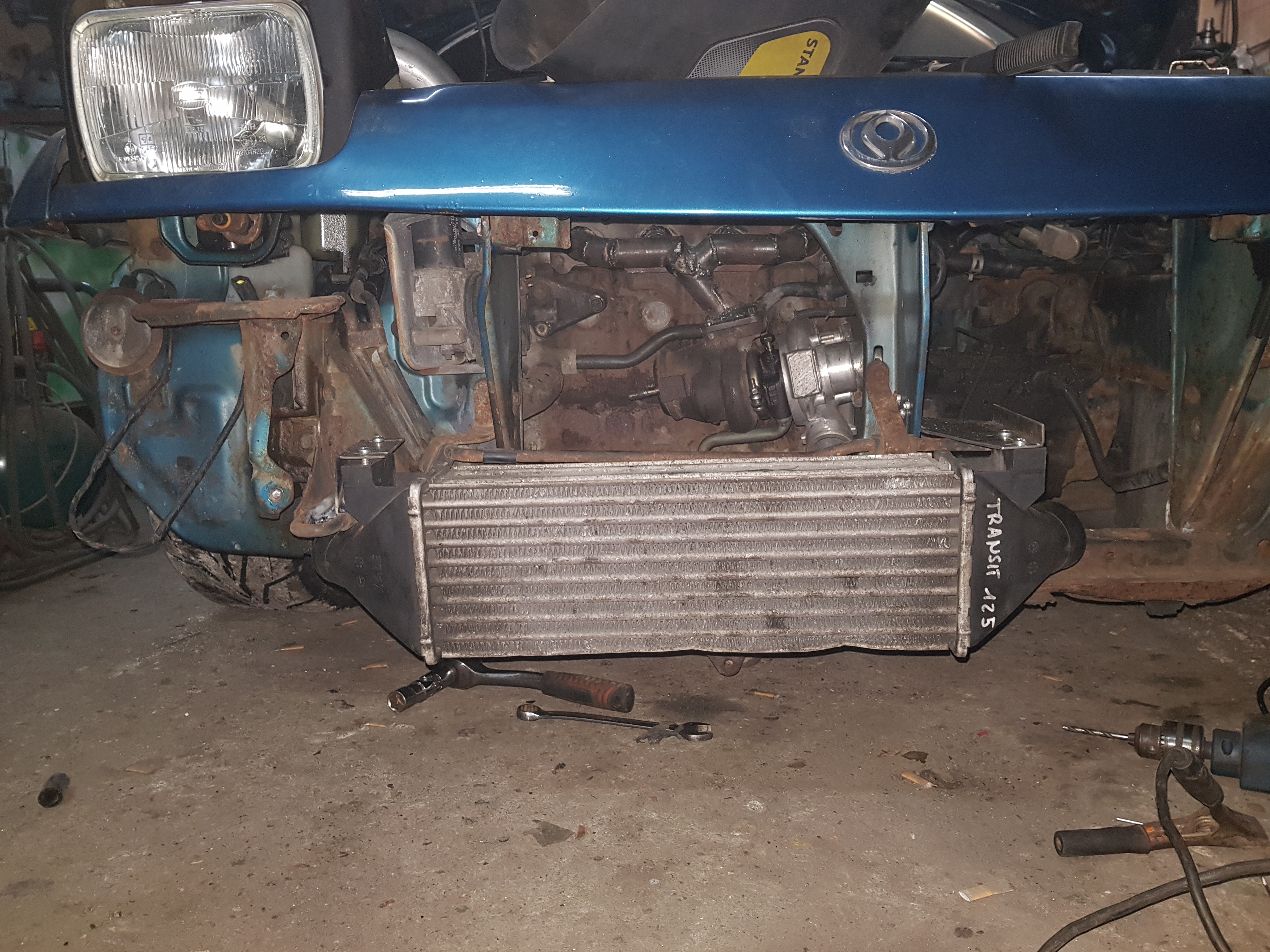 Zaczęliśmy od demontażu wszystkiego co mogło nam stanąć na drodze, czyli starego dolotu, kolektora wydechowego, zderzaka, chłodnicy i pewnie kilku innych rzeczy o których nie pamiętam.