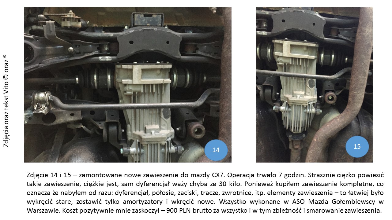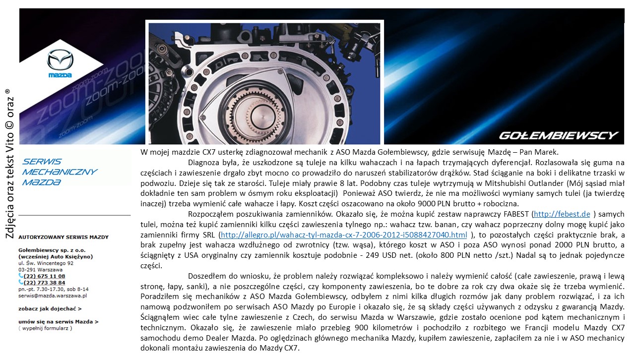 przymierzałem się do tego wątku od Marca 2015 rok. Stwierdziłem że go opiszę, bo widzę że brakuje rzetelnych informacji na temat zamienników i części do zawieszenia tylnego dla Mazdy CX7. Nie wiem czy jest to spowodowane, ale widzę ze na forum przejawia się ten wątek i sam też się z nim mierzyłem więc dzielę się wrażeniami.
