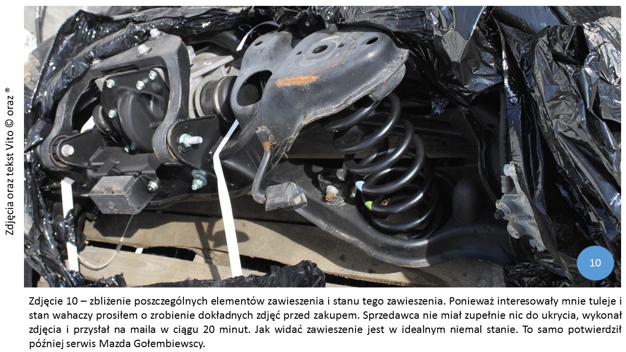 Jest tam napisane wprost – "... Wszelkie części nadające się do odsprzedaży zostają wymontowane i sprzedane. ...". To co robimy – uderzamy do byle serwisu ASO Mazdy z zapytaniem i już. Jak jestem na Dolnym Śląsku to mam blisko do Republiki Czeskiej, a w Hradec Kralove jest ASO Mazdy. Uderzam do kierownika serwisu i ten znajduje mi zawieszenie, bo to dla niego czysty pieniądz i nie zalega na półkach w magazynie.