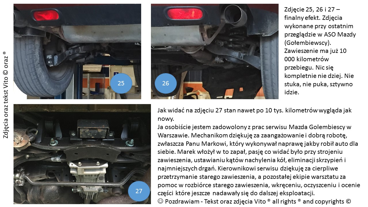 Weryfikacja i potwierdzenie po 5 miesiącach roboty serwisu ASO Mazda Gołembiewscy. Przy przeglądzie serwisowym, mechanicy sprawdzili stan swojej roboty i stan zawieszenia. Werdykt bez zastrzeżeń – wydruki też są, zawsze je robią przy przeglądzie. :)