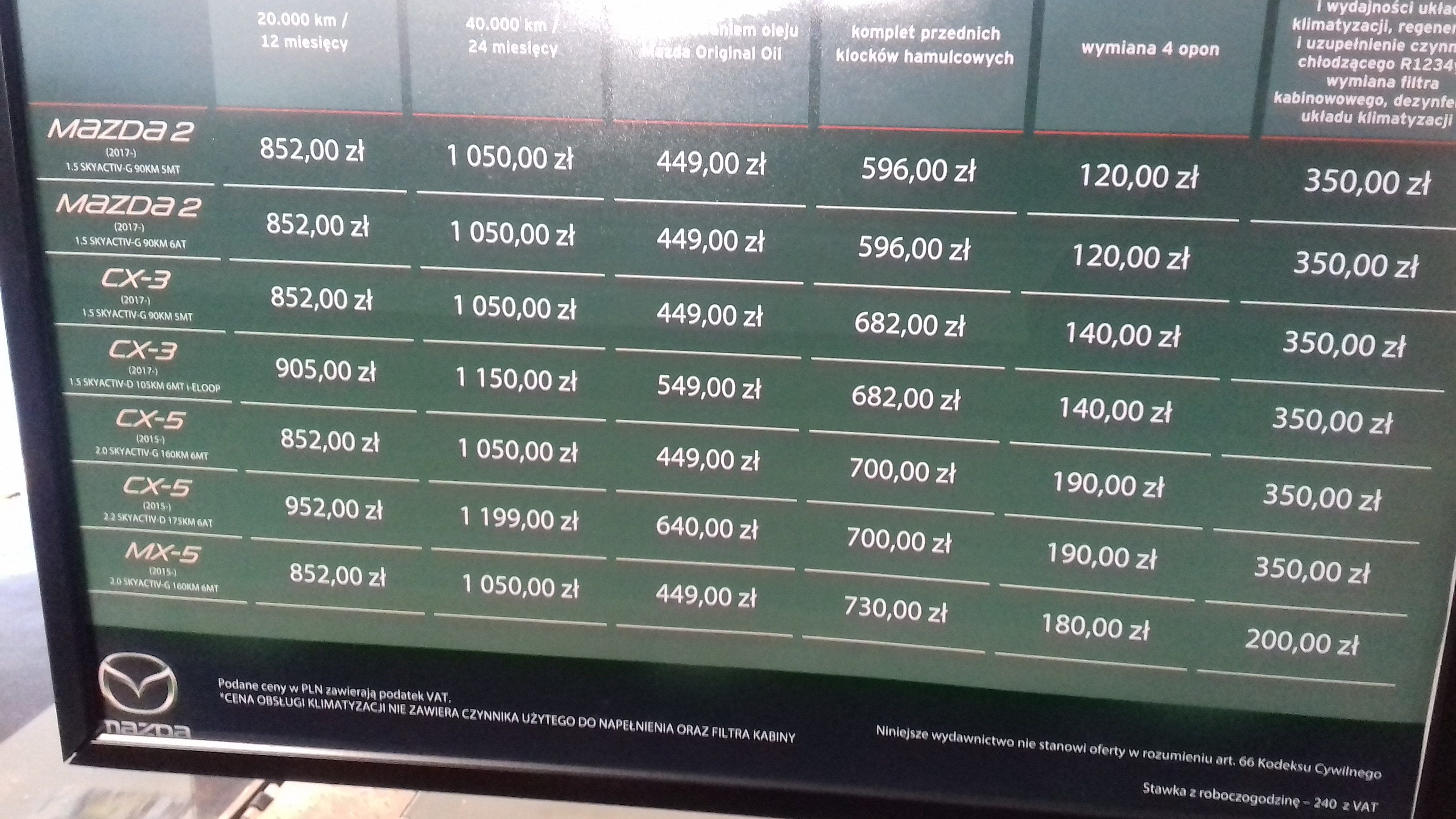 Na pytanie o różnicę w przeglądzie CX 3 AWD i zwykłej odpowiedź brzmi nie ma żadnej ani w cenie i fizycznie też , dopiero przy dużym przebiegu (ok 120tyś) w AWD wymiana oleju w jakiejś przekładni? Natomiast jest różnica ,zauważyłem w cenniku między benzyną a dieslem ,jaka ?nie zapytałem .Po odbiór za ok 2,5 godziny mam przyjechać , ale będą dzwonić , to dokończę posta