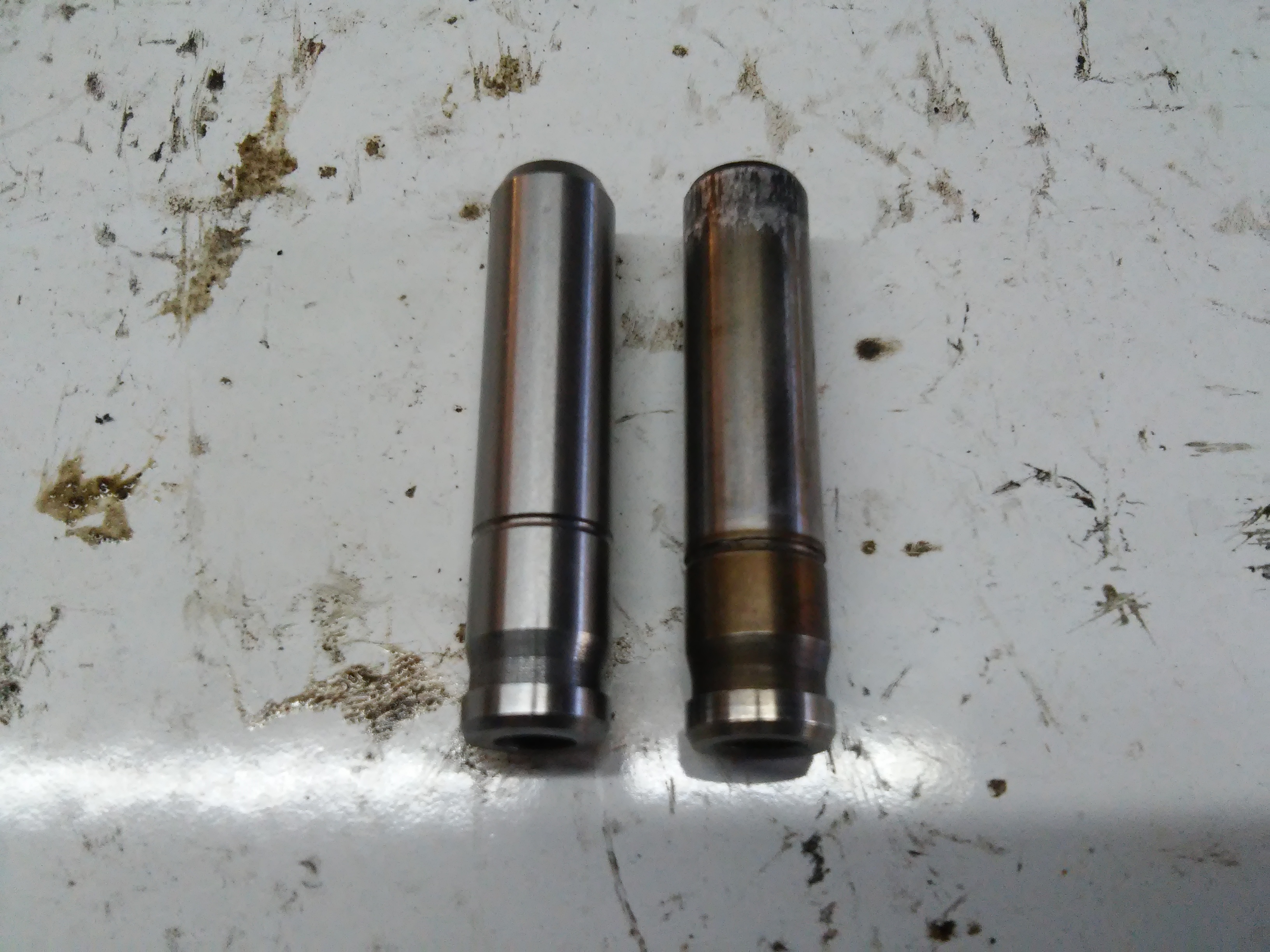 W międzyczasie ogarnąłem też głowice. Oczywiście gruba warstwa spalonego oleju była wszędzie. Po czyszczeniu przyszła pora na weryfikację. 23 zawory mieściły się w tolerancji, jeden wydechowy miał nadpaloną przylgnię tak mocno, że szlifowanie nie wystarczyło i trzeba było go wymienić tak jak i jego prowadnicę. Poza tym oczywiście wszystkie gniazda wydechowe trzeba było pszefrezować a zawory szlifować. Ssące wystarczyło dotrzeć. Potem składanie oczywiście na nowych uszczelniaczach bo stare były z drewna