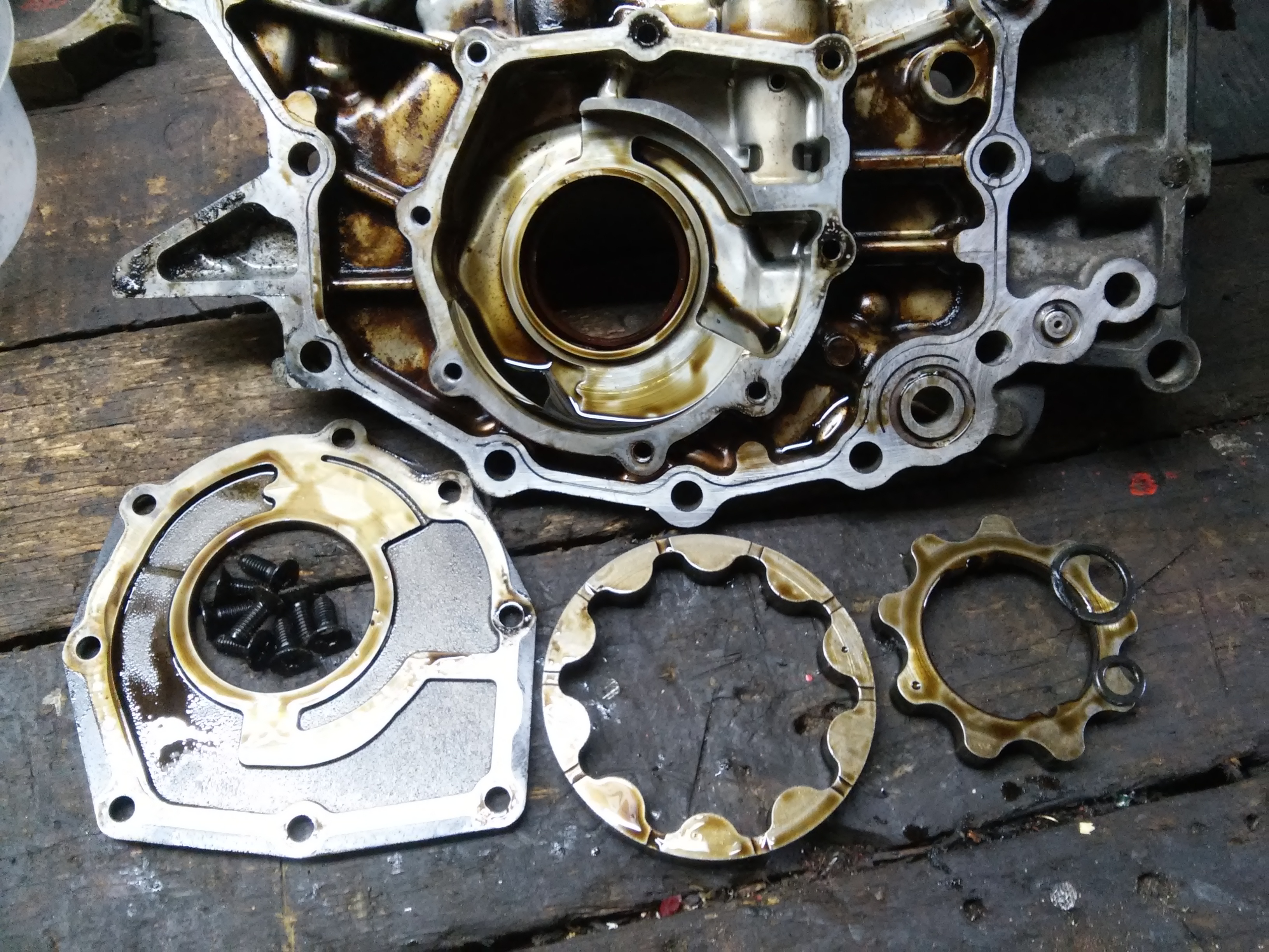 Pompę oleju przejrzałem i powymieniałem wszystkie zimeringi. Teraz czas na osprzęt. Jako, że silnik był cały zalany olejem w sumie nie wiadomo dokładnie z kąd postanowiłem rozebrać także pompę vacum, zresztą itak był luz na łożysku. Łopatki w idealnym stanie więc wymieniłem uszczelniacze bo są dwa i łożysko. Uszczelniacze oczywiście w nietypowym rozmiarze wewnętrznym ale udało się dopasować metryczne ciut mniejsze o dużej tolerancji rozmiaru wałka.