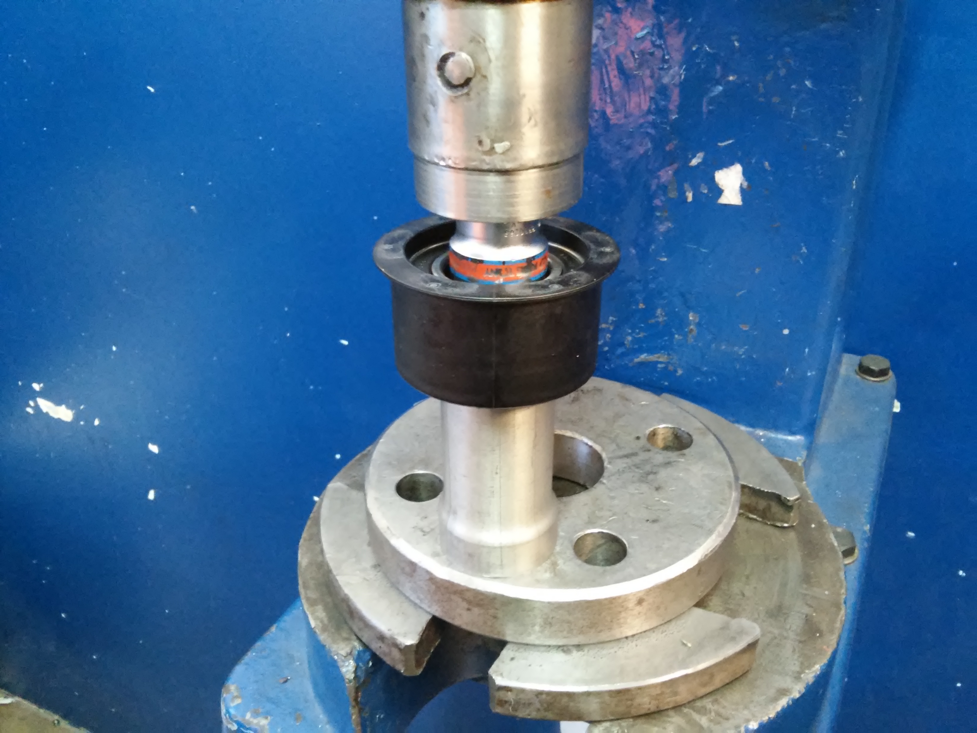Alternator też rozebrałem, wyczyściłem i wymieniłem jedno łożysko. To w sprzęgle pompy klimatyzacji zostało wymyte i dostało nowy smar łożyskowy. Teraz pracuje jak nowe. Rolki napinające pasków napędowych także dostały nowe łożyska. Rolki prowadzące rozrządu wymieniłem. Dolna prawa rolka pasuje od KLa tylko trzeba wycisnąć środek i wcisnąć odwrotnie