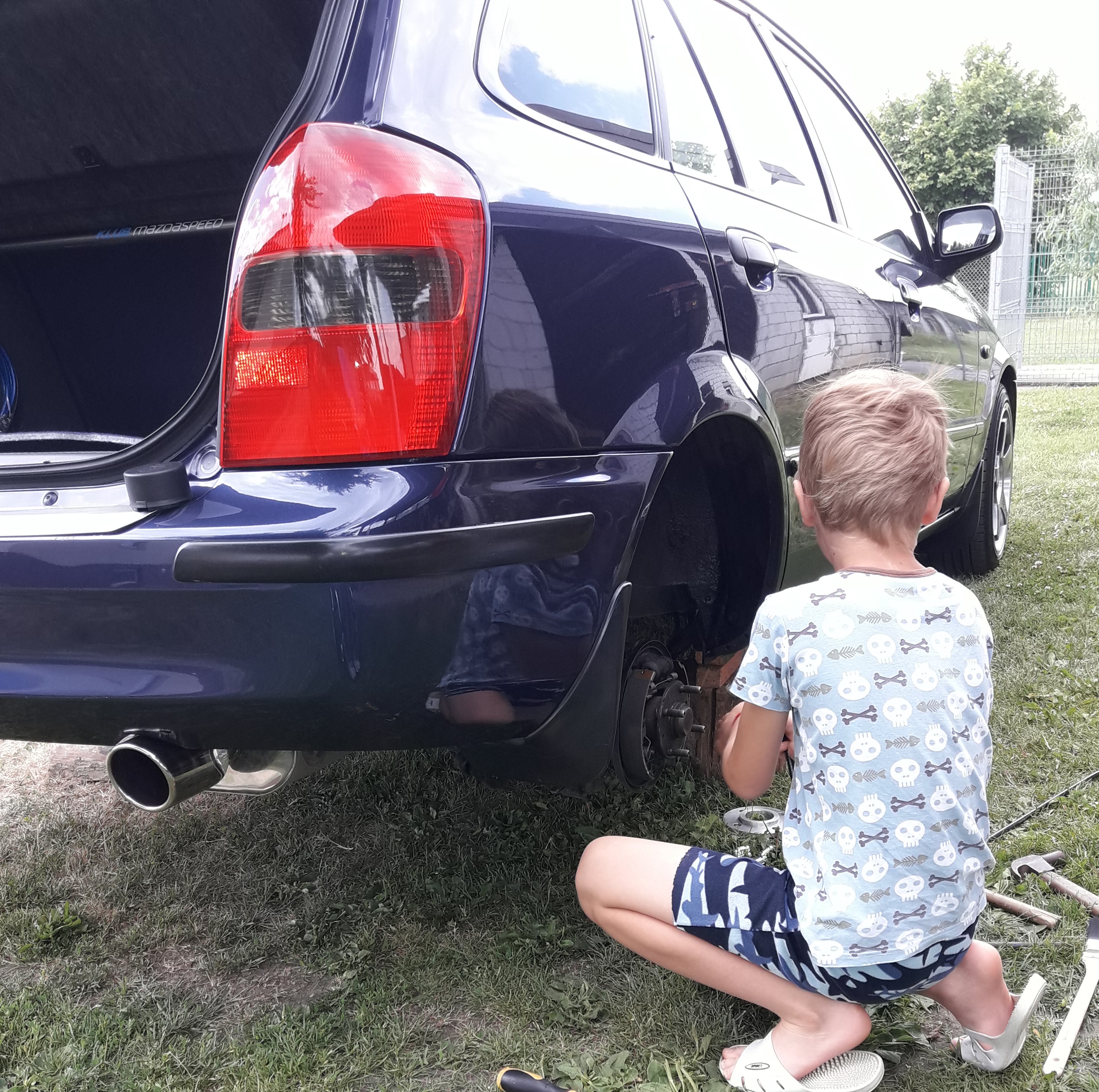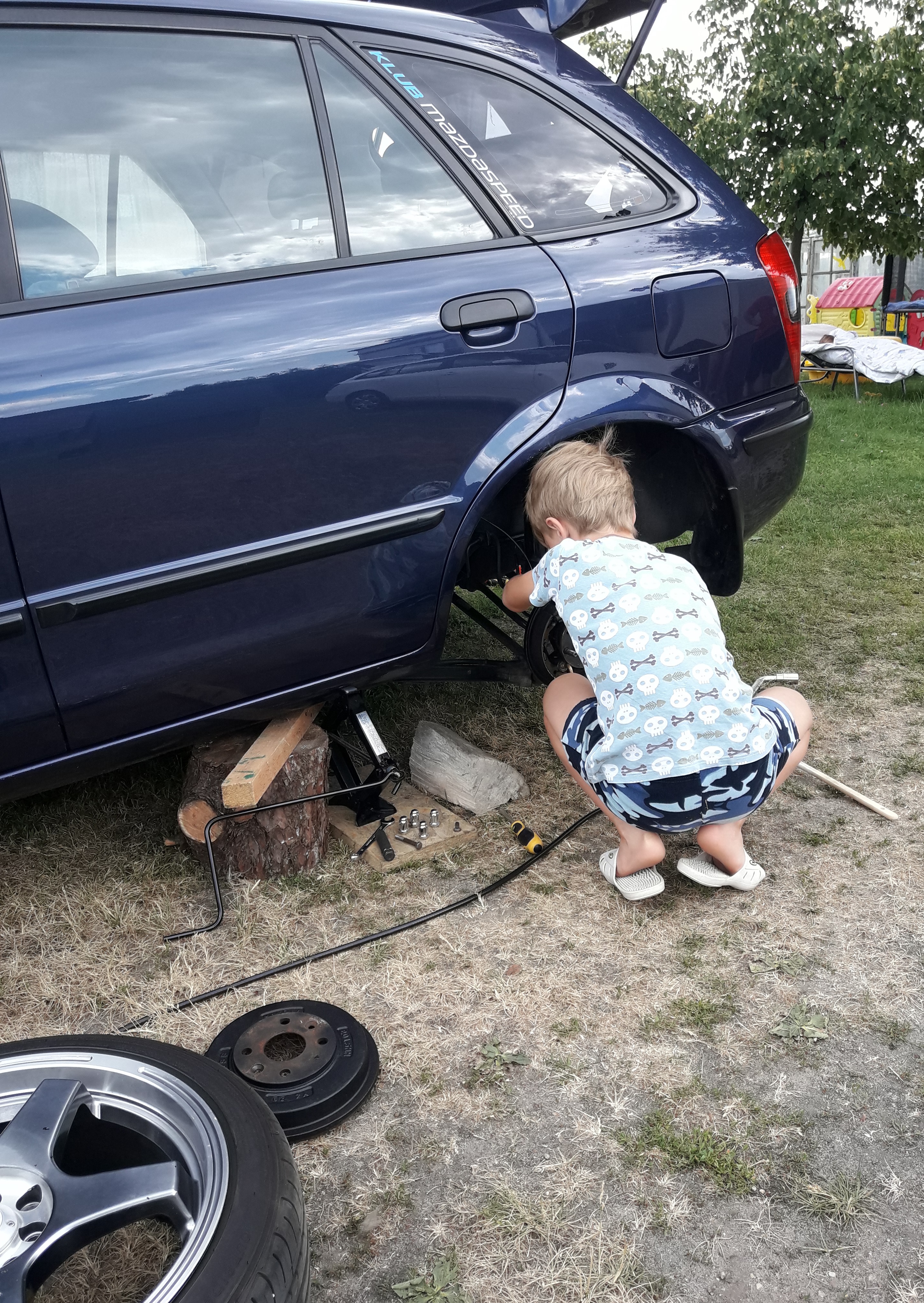 we dwójkę podnieśliśmy mazdalenkę, odkręciliśmy kółka i zabraliśmy się za czyszczenie wnęk nadkoli...później przyszła pora na środek zwalczający RUDĄ , podkład epoksydowy i baranek...wyszło ładnie i schludnie...Kubuś entuzjasta mojej madzi dzielnie mi pomagał i robota szła nam nadzwyczaj szybko