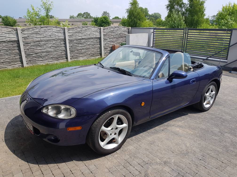 Mazda kupiona przeze mnie w maju 2018. Wyprodukowana w 2003 roku, pierwsza rejestracja 2004. Silnik 1.8 146 KM wersja NBFL, szpera, limitowana edycja na pełnym wypasie – Memories II. Kolor: 22A – Midnight Blue Mica (2001-2003) AKA Supreme Blue Mica. Dach materiałowy z szybą, stan bdb. Przebieg około 117 tys. – w dużej części udokumentowany, wydaje się być realny. Na aucie pełen komplet fabrycznych rozpórek. Ani grama rdzy, podwozie zakonserwowane z gwarancją do 11.2018r.