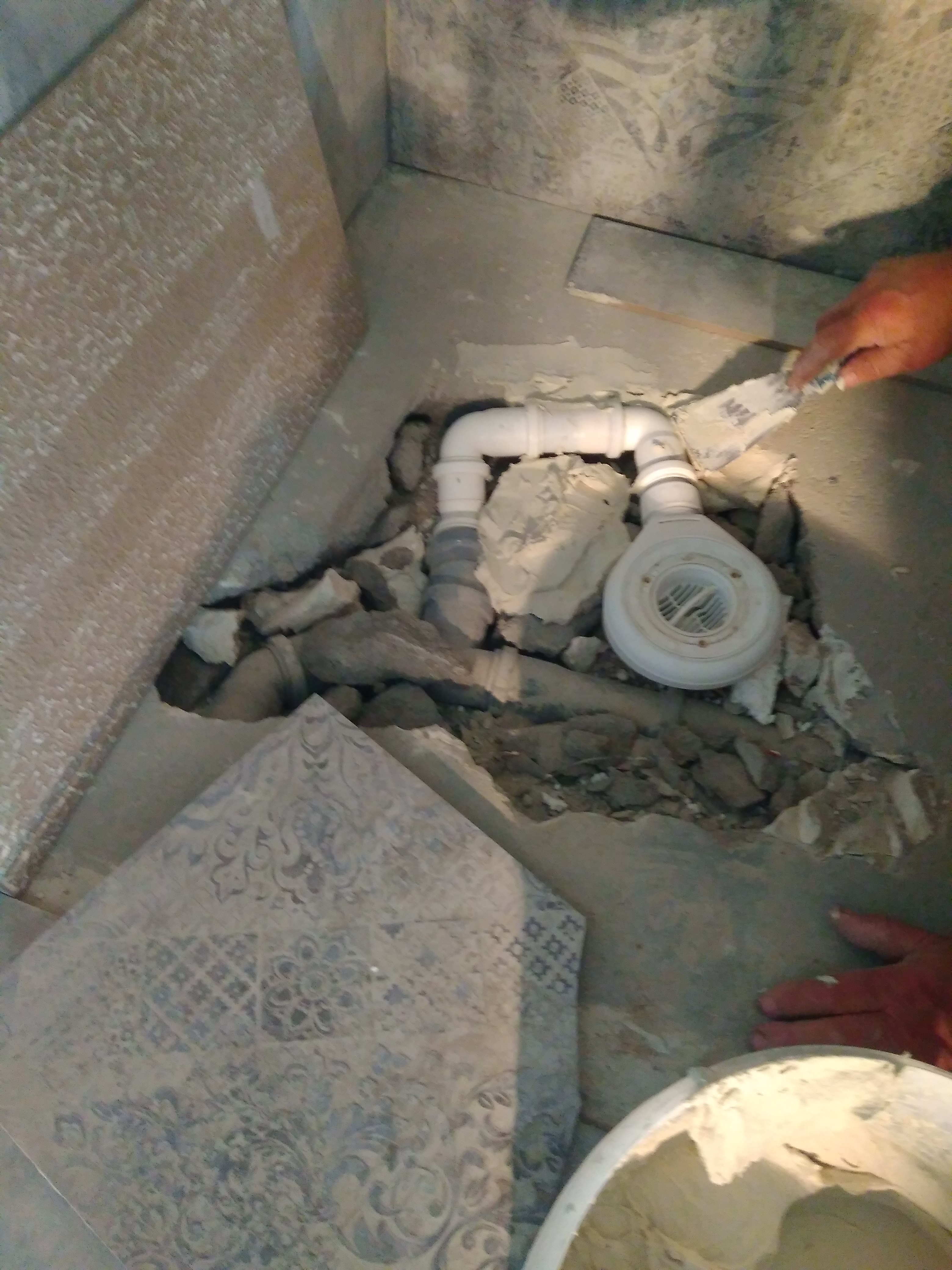 Nie mogłem skuć całej podłogi, bo jest podłogówka (okazało się że w okolicy odpływu jej nie było, trafiłem tylko na stelarz i folię). Więc odkulismh ci się dało, podgieliśmy rurę, wstawiliśmy dodatkowy trójnik i jakoś poszło.