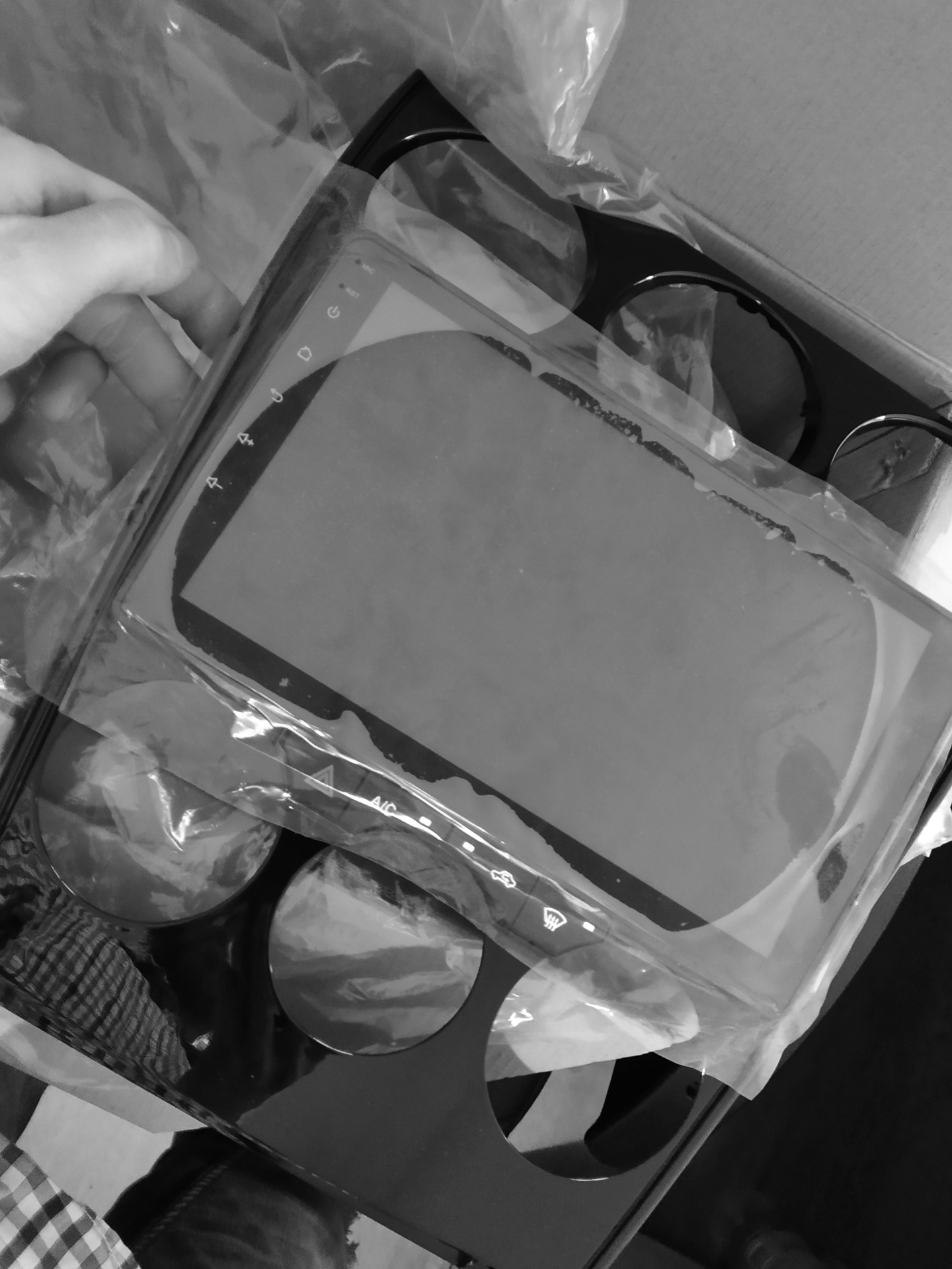 I ostatnia rzecz w oczekiwaniu na wyświetlacz – kamera cofania w ramce. Gdzieś na forum przeczytałem w poradnikach, że nie warto montować kamery w ramce, bo wiąże się to z koniecznością wywiercenia otworu na przewody. Nic bardziej mylnego. Po ściągnięciu plastikowej osłony mamy dostęp do dwóch otworów zaklejonych przezroczystą folią. Idealne na przewody!