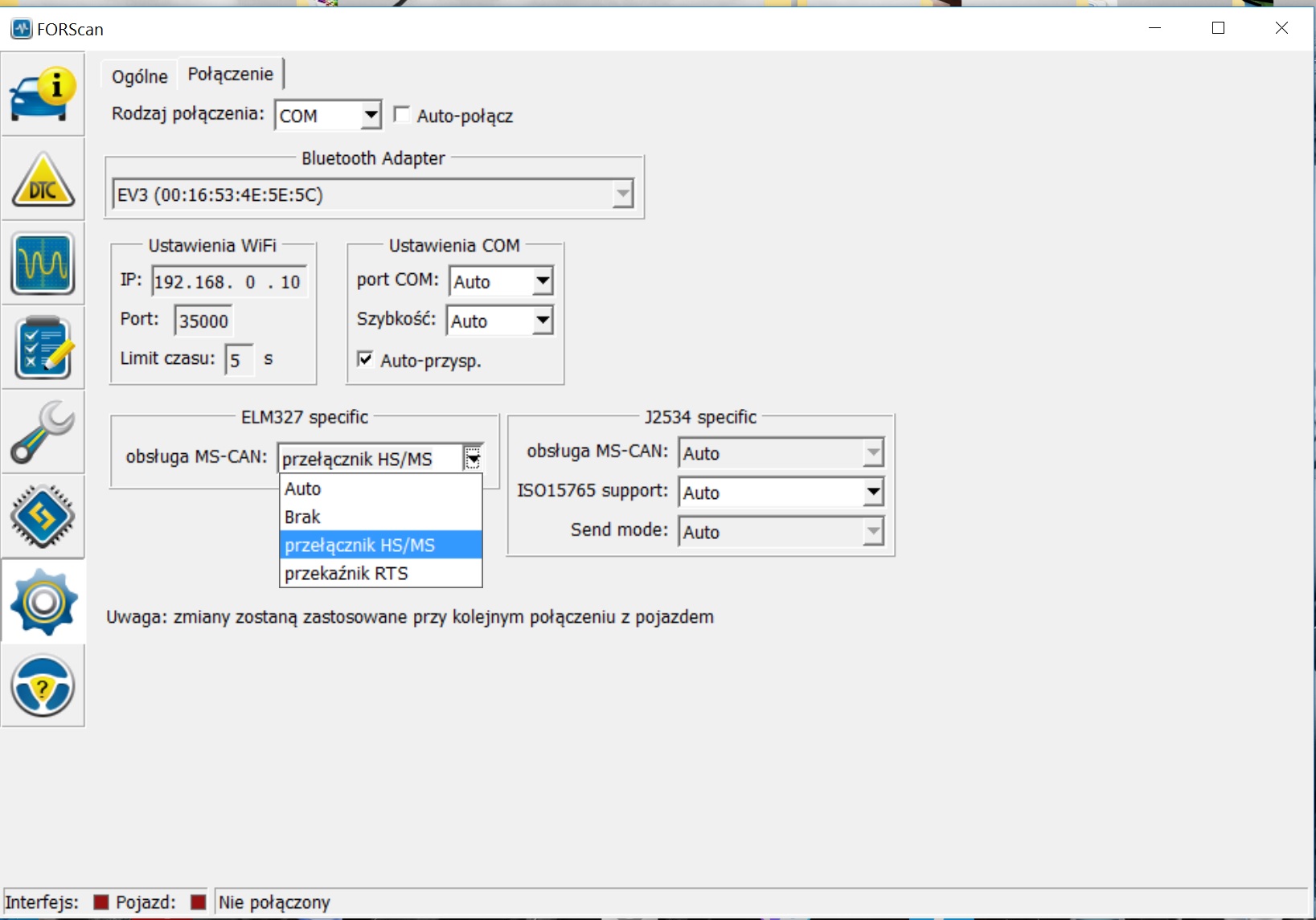 Teraz tak patrzę na ustawienia/połączenie w forscan.