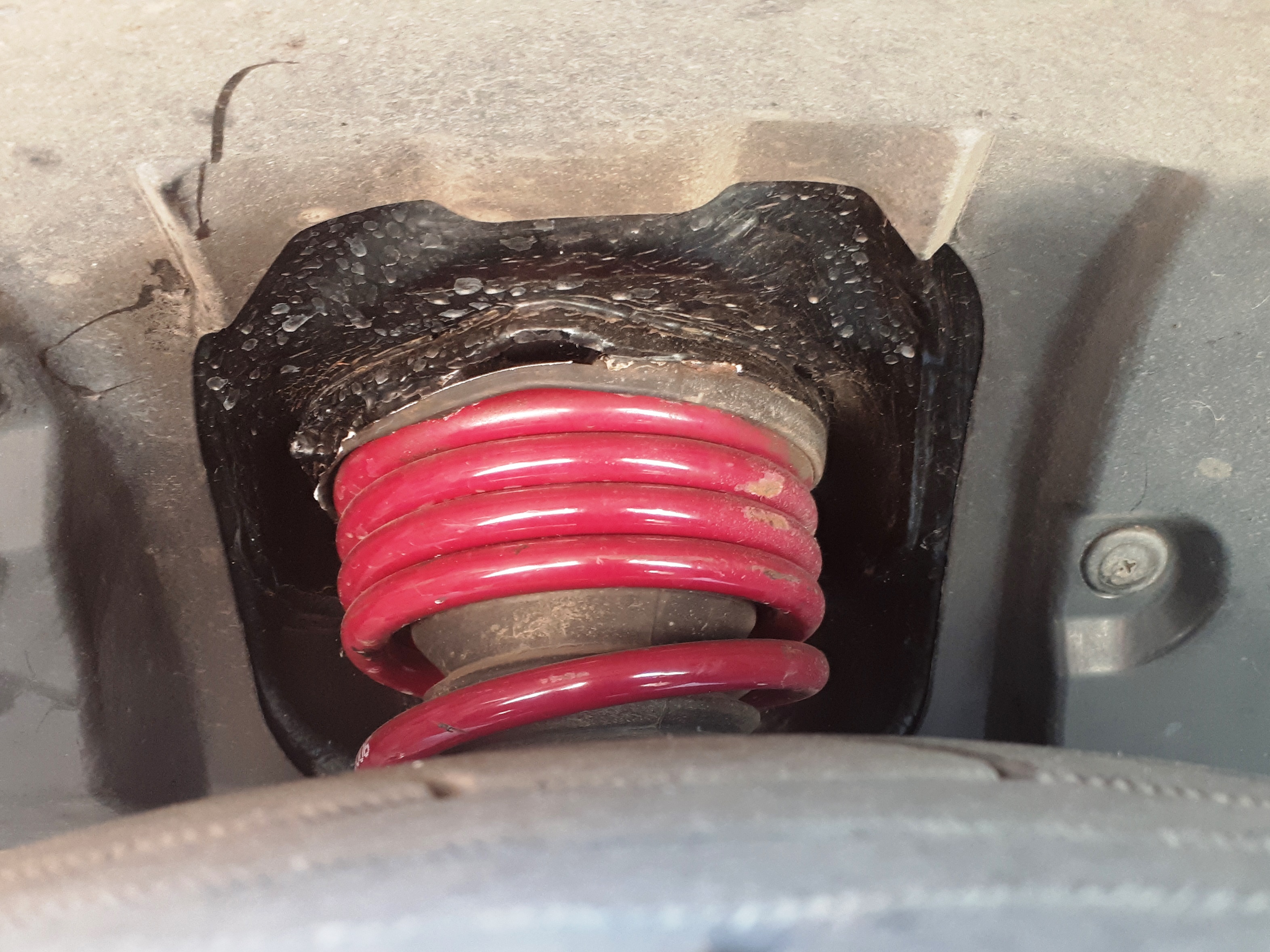Dodatkowo, z pomocą Adisa, skróciliśmy przednie sprężyny o jeden zwój. Na amortyzatorach KONI przód wciąż stał jakoś dziwnie wyżej względem tyłu i było tak zarówno na sprężynach Eibacha jak i na Vogtlandach. Wyglądało to słabo. Skoro 4 zwoje leżały na sobie, to stwierdziłem, że nie ma co się pieścić i jeden mniej nie spowoduje różnicy pracy zawieszenia. Operacja poszła pomyślnie, nie zauważyłem zmian w pracy zawieszenia, a wysokościowo zeszło w dół o grubość zwoju, dzięki czemu przód się z grubsza wyrównał się z tyłem i nie kłuje już w oczy.