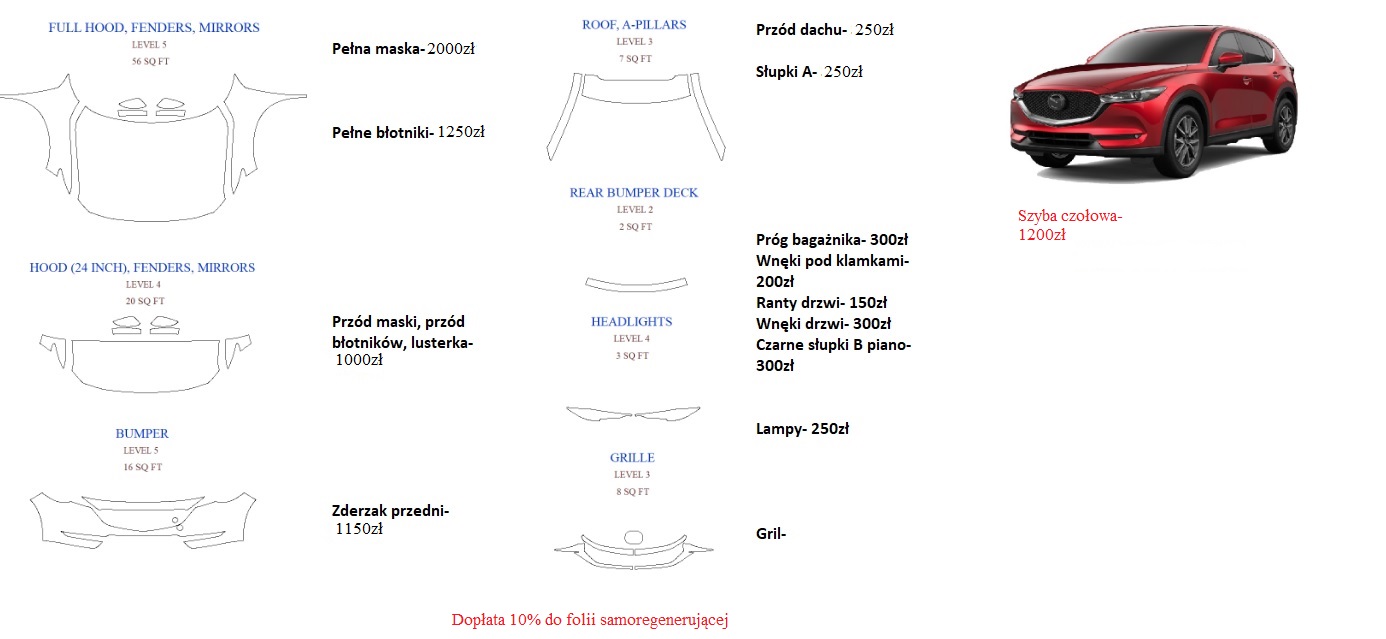 . Mam też z tego roku 2,5 l.Cx5 4x4 i zaraz po zakupie ją zabezpieczyłem i jest ok. Lakier jest nieodporny na odpryski od kamieni proponuję ofoliowanie maski po zakupie. Proponuję zrobić podobnie Gdzie na terenie Warszawy najlepiej zrobic ofoliowanie dla cx5 z salonu? Czy ofoliowac całą czy wystarczy polowa maski? Dostałem takie zwstawienie i nie wiem czy to drogo czy nie......