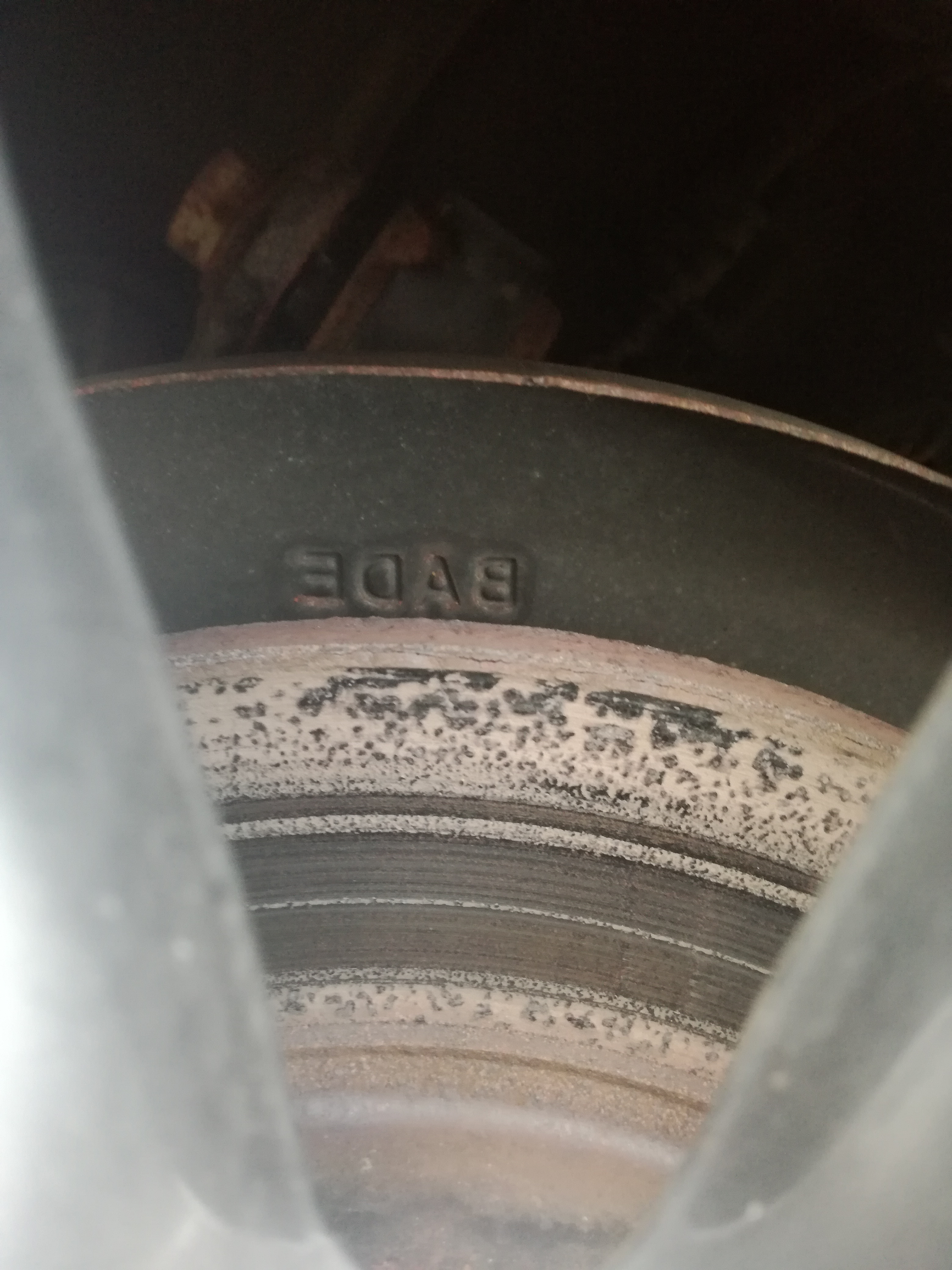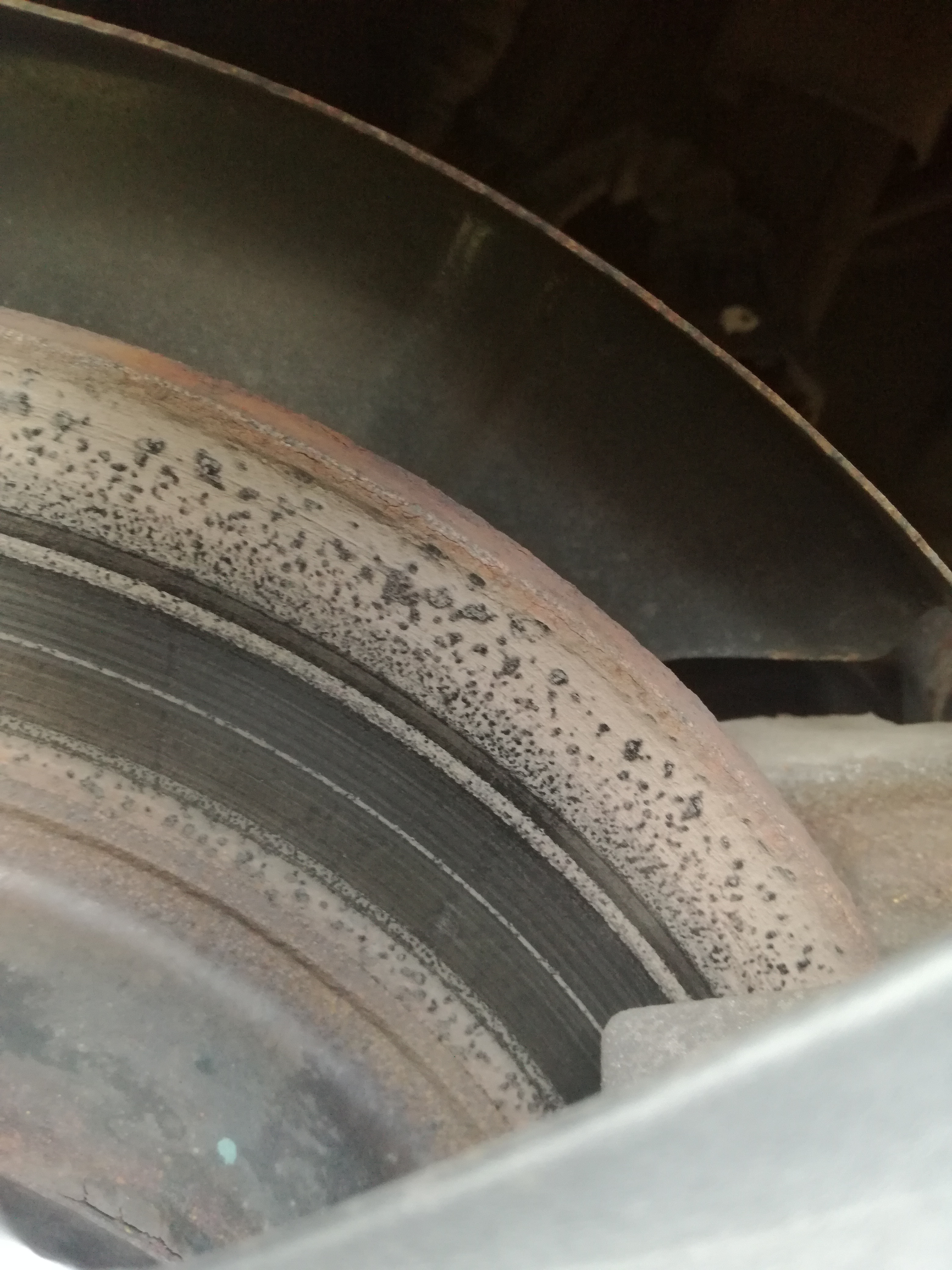 U mnie po ponad dwóch latach użytkowania powierzchnia tylnych tarcz hamulcowych wygląda jak poniżej (tarcze i klocki nadal te same, które były przy odbiorze mazdy z salonu, żadnego demontażu sam nie uskuteczniałem). Sądząc po grubości niezebranej warstwy na tarczy, od jakiegoś czasu problem musi już występować – o ile nie od nowości, bo problemem jest chyba sam montaż elementów. Sam przyznam, że nie zwracałem wcześniej uwagi na stan tarcz, więc nie wiem od kiedy problem występuje. 4 miesiące temu byłem na serwisie w ASO, grubość klocków niby mierzyli, o stanie tarcz nic nie mówili.
