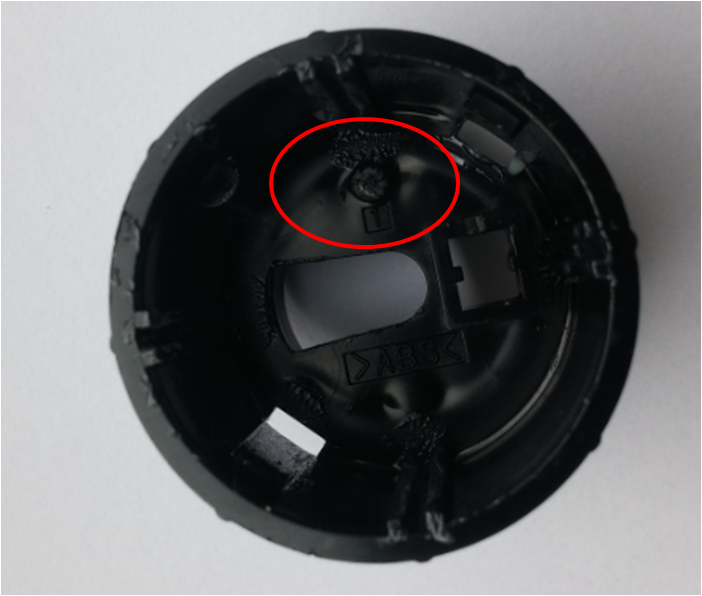 Po rozebraniu pokrętła dostrzegłem delikatne, wypukłe odkształcenie wewnątrz zewnętrznej tulejki, po drugiej stronie otworu śrubki.
