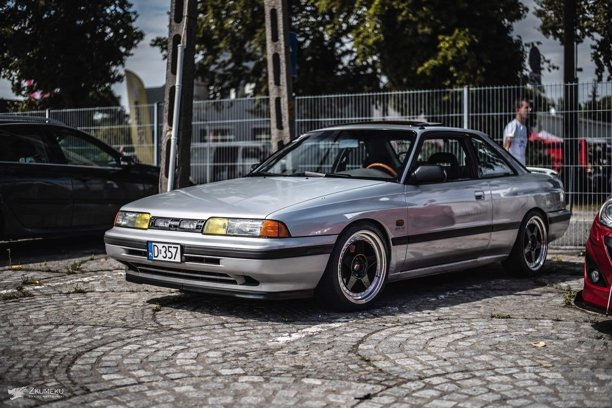 Auto ma Grill z halogenami, szyberdach, tylna blenda USDM, owiewka szyberdachu. Zawieszenie to przerobiony gwint z forda Probe mk2. Felgi jakieś no name 16 cali. Kolor auta K3 czyli srebrny metalik.