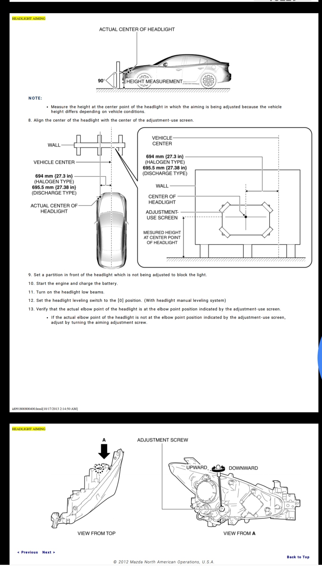 Tutaj instrukcja dla poprzedniej generacji (BM), na reflektorze znajdziecie informację jaki procentowy spadek strumienia światła jest dopuszczalny w waszym przypadku (skrótowo jeśli będzie to 1%, oznacza to że co metr wysokość świecenia Waszego reflektora powinna spadać o 1cm). Przeważnie regulację wykonuje się w odległości 5-10 metrów od ściany, instrukcja obsługi Mazdy przewiduje regulację w odległości 3m.