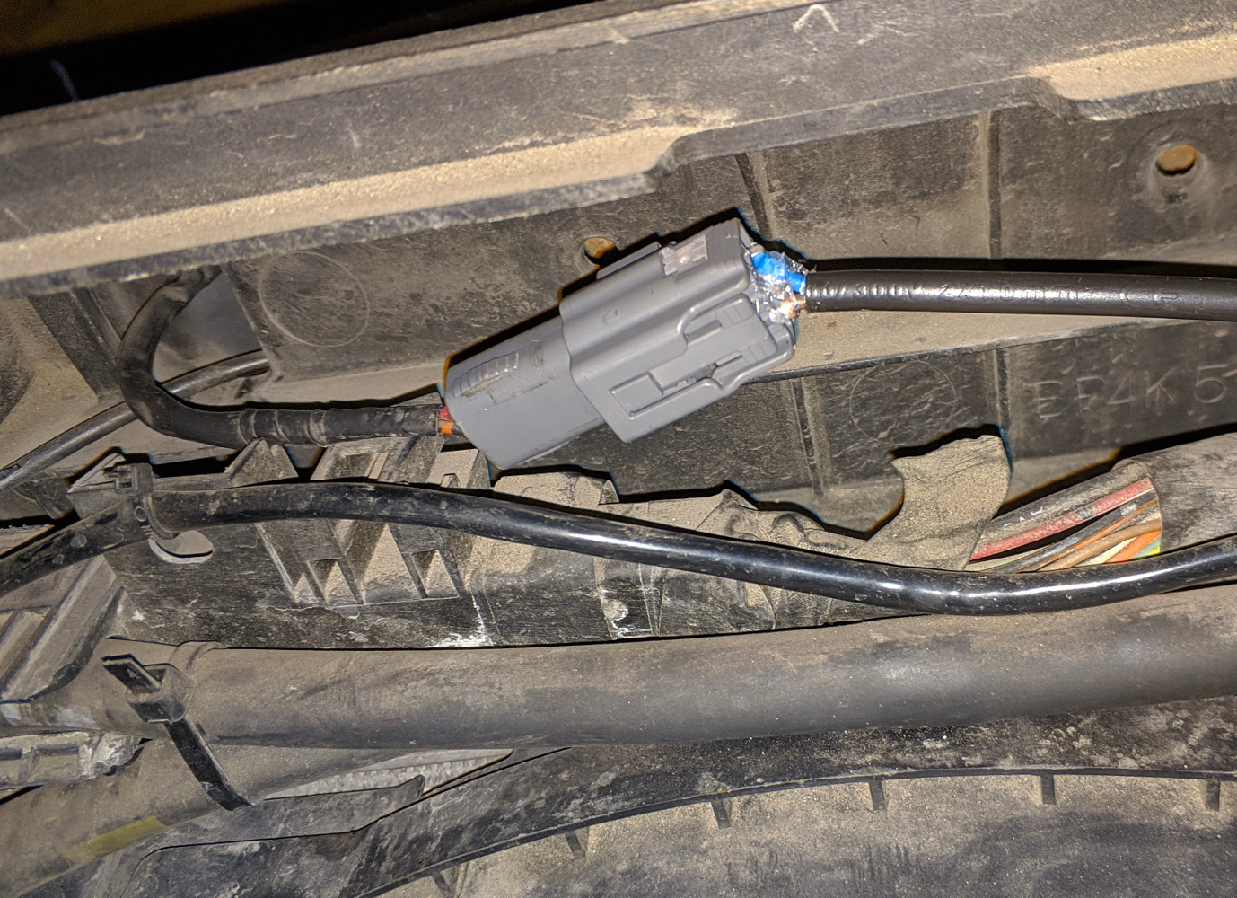4. Wracamy do bagażnika. Sprawdzamy, które kable prowadzą do oświetlenia żarówki (w moim przypadku jest to pomarańczowy z paskiem i jedną kropką oraz czarny z paskiem i dwiema kropkami jak na zdjęciu)