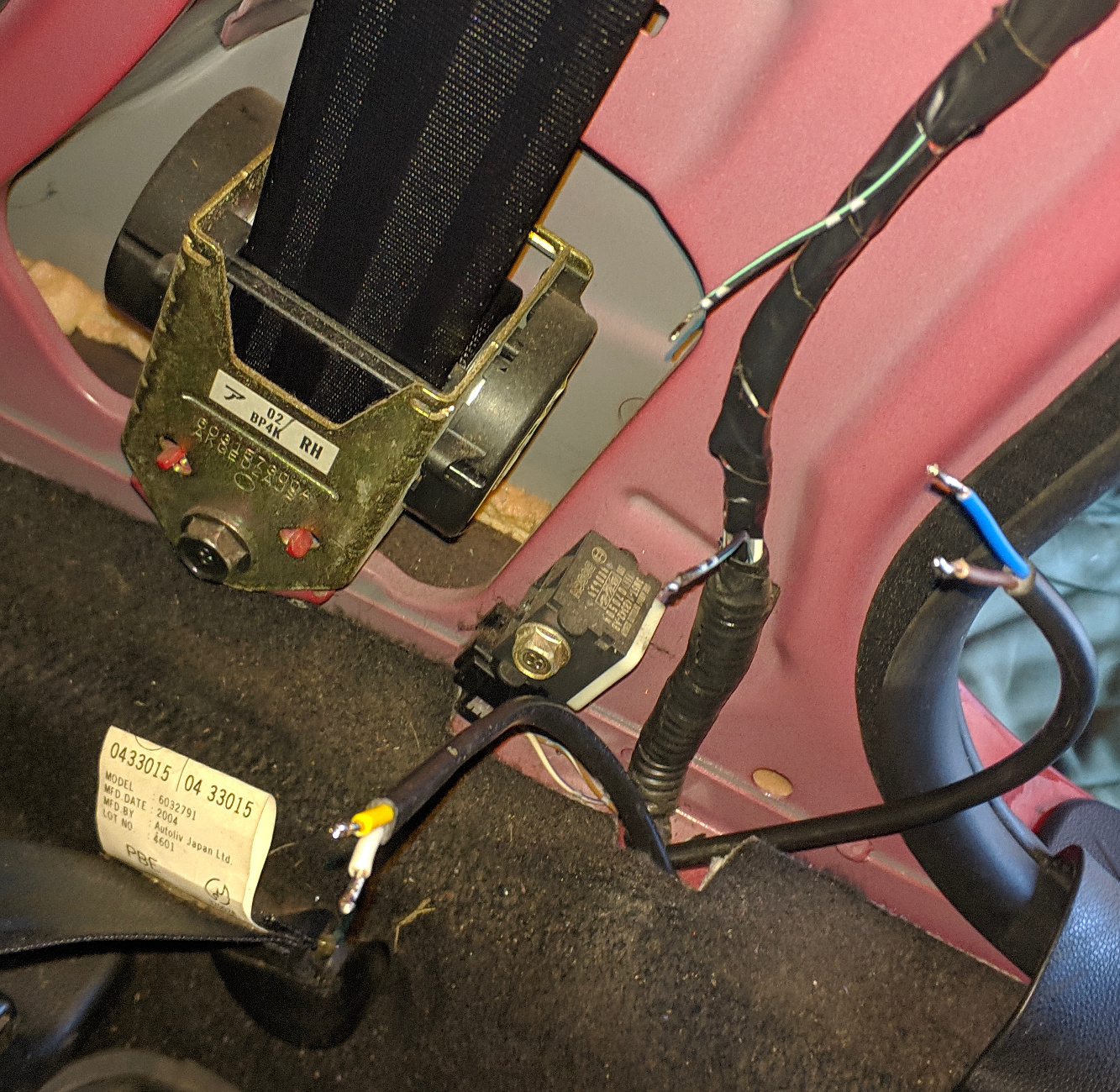 7. Drugą część kabla przeciągamy pod podłogą w stronę słupka za fotelem pasażera (do którego przykręcone są tylne prawe drzwi)