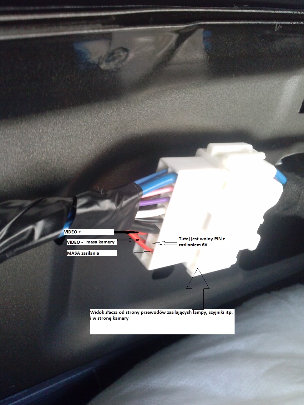 5. Jeśli Wasze autko ma czujniki parkowania, to ma z tyłu ( w klapie bagażnika ) na złączu już okablowanie do kamery ( sygnały GND, AUDIO-, AUDIO+ są wyprowadzone z wtyczki i "zawinięte" -schowane -we wiązce z kablami . trzeba tylko z wtyczki wyprowadzić napięcie ACC+ 6V do przetwrorniczki.