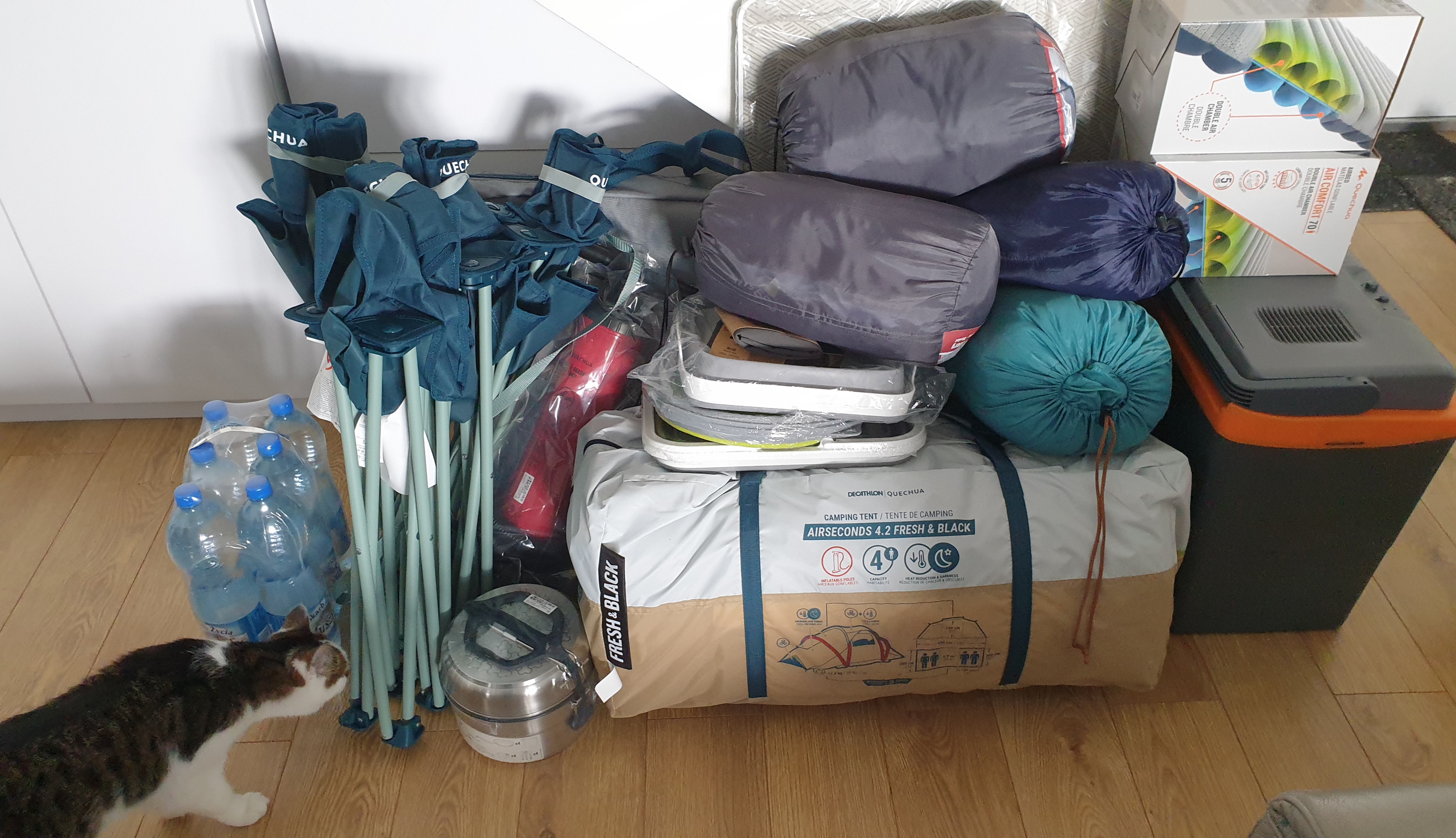 Wytargałem to wszystko z auta. Naprawdę jestem pełen podziwu dla ludzkiego sprytu i pomysłowości – zająłem 70% bagażnika, a z tego co tu leży jestem w stanie zrobić całkiem duży obóz dla 4 osób. Przy 100% zapełnieniu będę miał wszystko, czego trzeba do życia w ciepłym klimacie. Z takiego małego Golfa wylezie mały domek.