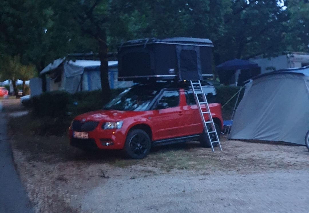 Widziałem też Skodę chyba Yeti, która miała namiot na dachu.