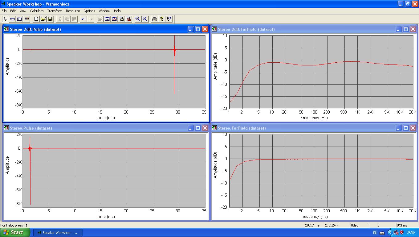 Tryb Direct oraz Tryb Stereo bez korekty częstotliwości. Charakterystyka liniowa od góry do doły. Opóźnienia zerowe ( opóźnienie które występuje jest opóźnieniem całego zestawu pomiarowego )